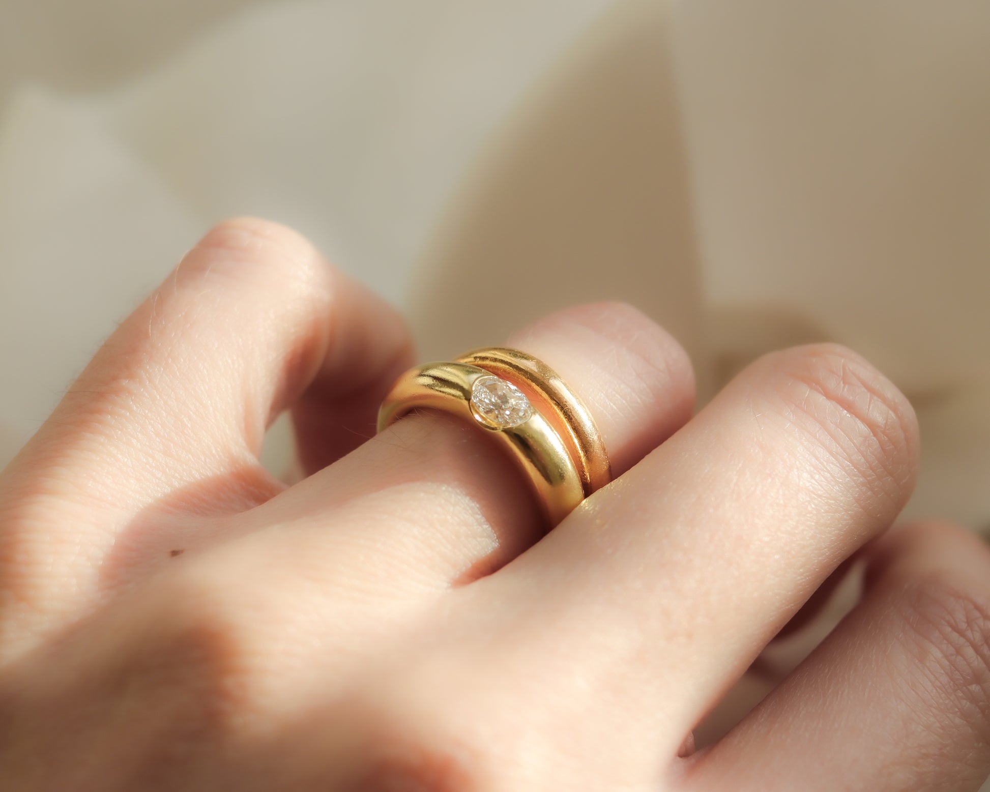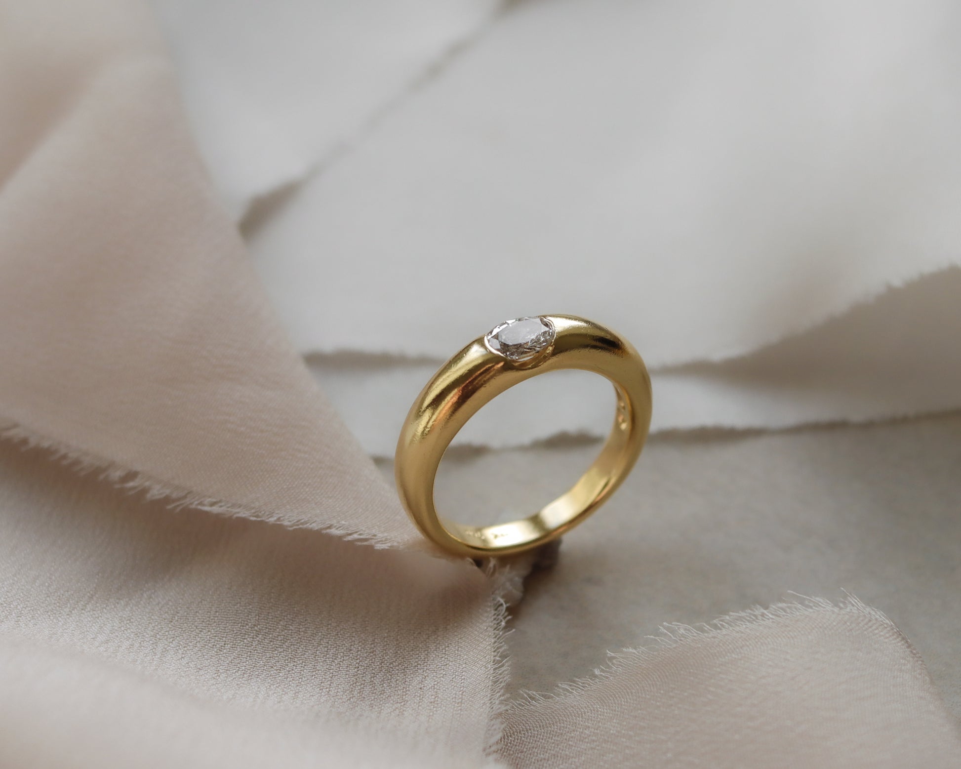 A striking and beautifully sculptural diamond ring crafted in solid 18ct gold, featuring a contemporary eclipse-style setting that cradles an oval-cut diamond set in an elegant east–west orientation. The diamond weighs approximately 0.50 carats and is seamlessly integrated into the design, allowing the smooth curves of the gold to partially embrace the stone and create a sense of movement and modernity.