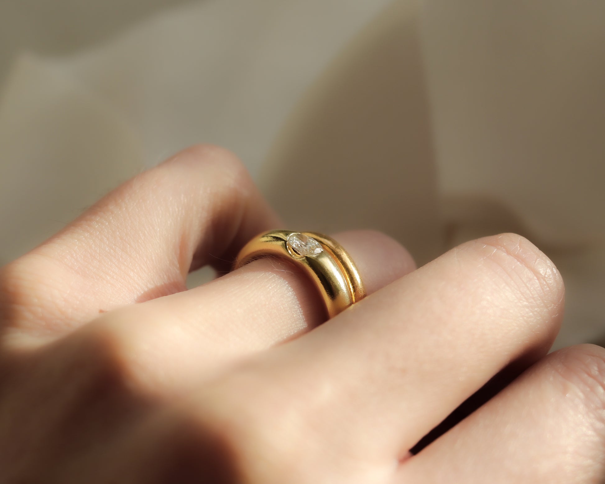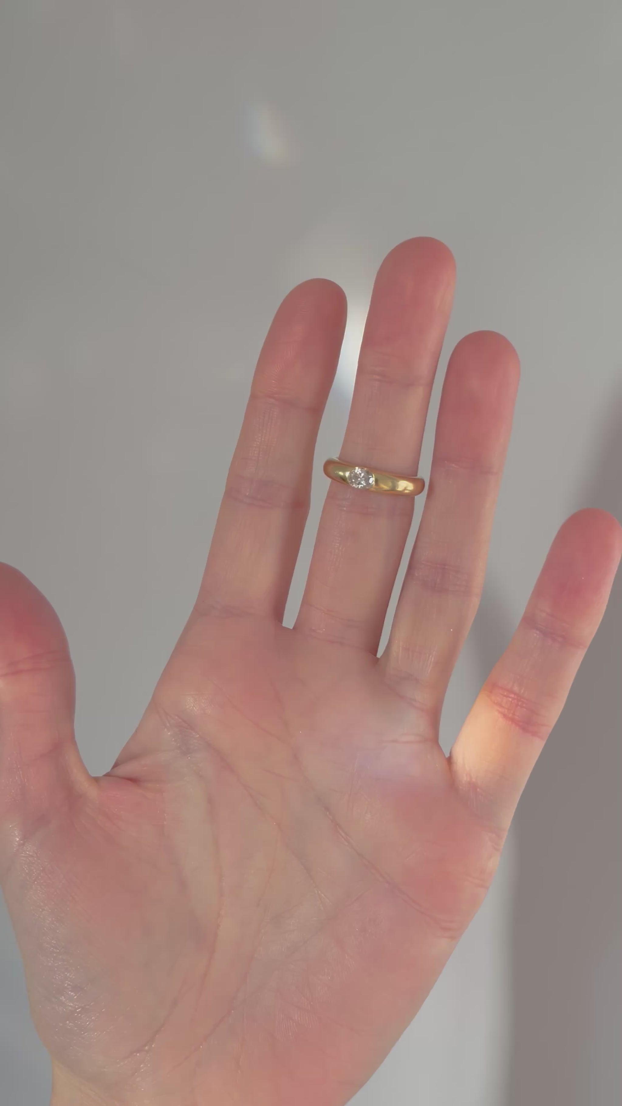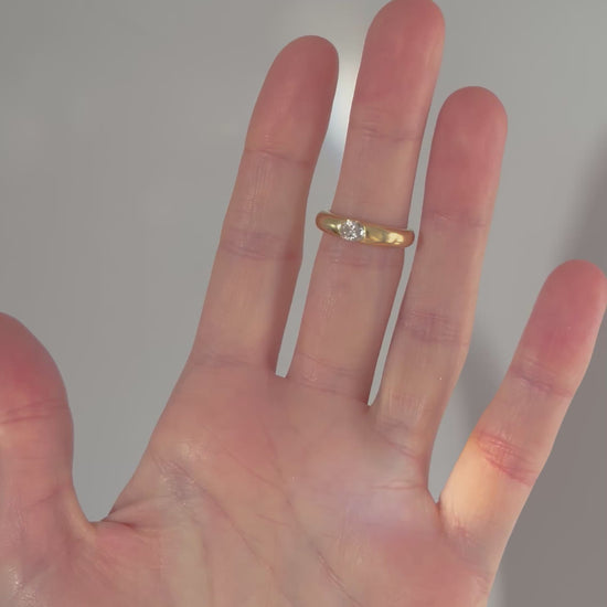 The ring is formed with a substantial chunky “doughnut” style band, giving it a bold yet refined presence on the hand. With a total weight of 6.3 grams, it feels luxurious and reassuringly solid, while remaining exceptionally comfortable to wear. The high-polish finish enhances the warm tone of the 18ct gold and beautifully offsets the brilliance of the diamond.