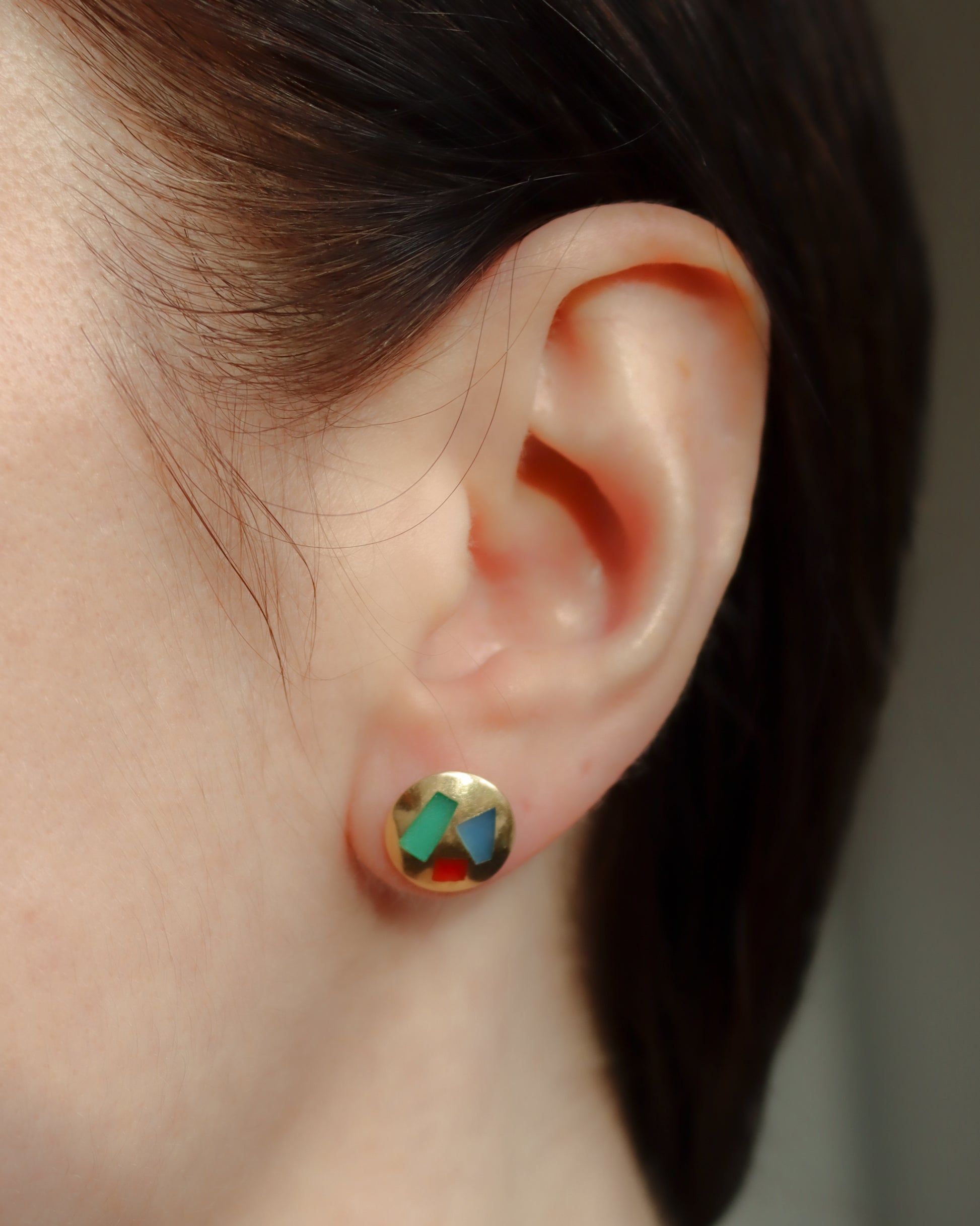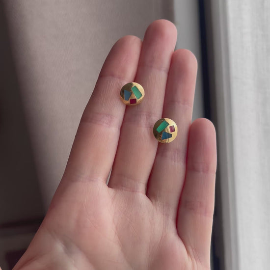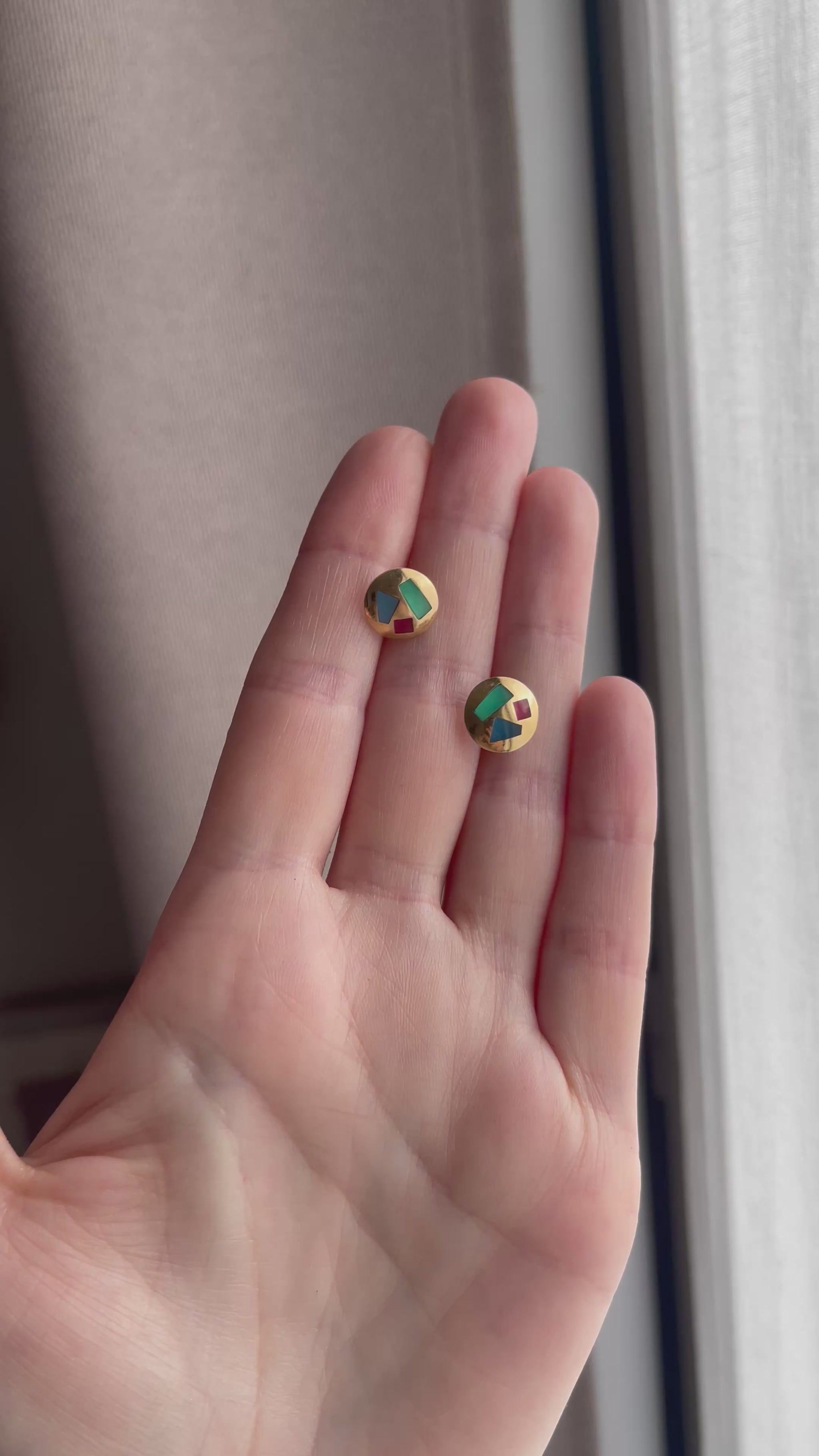18ct Gold Gemstone Inlayed Geometric Disc Earrings