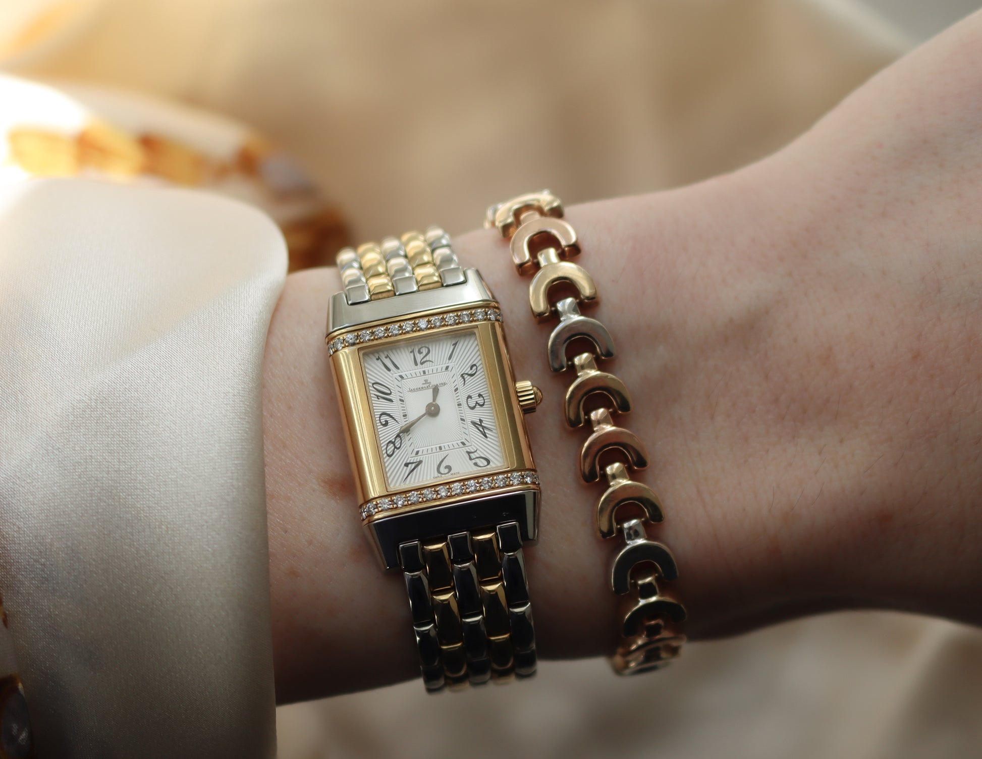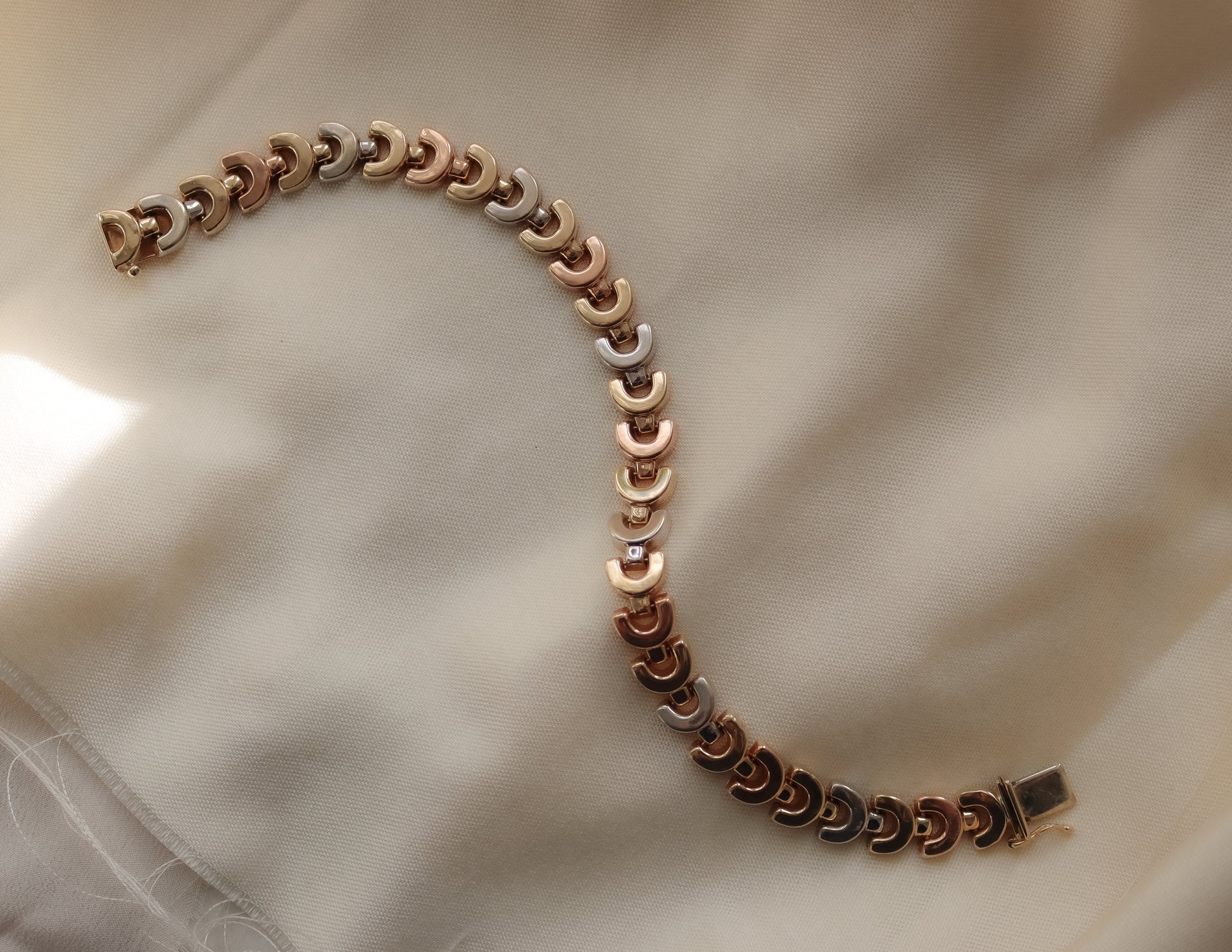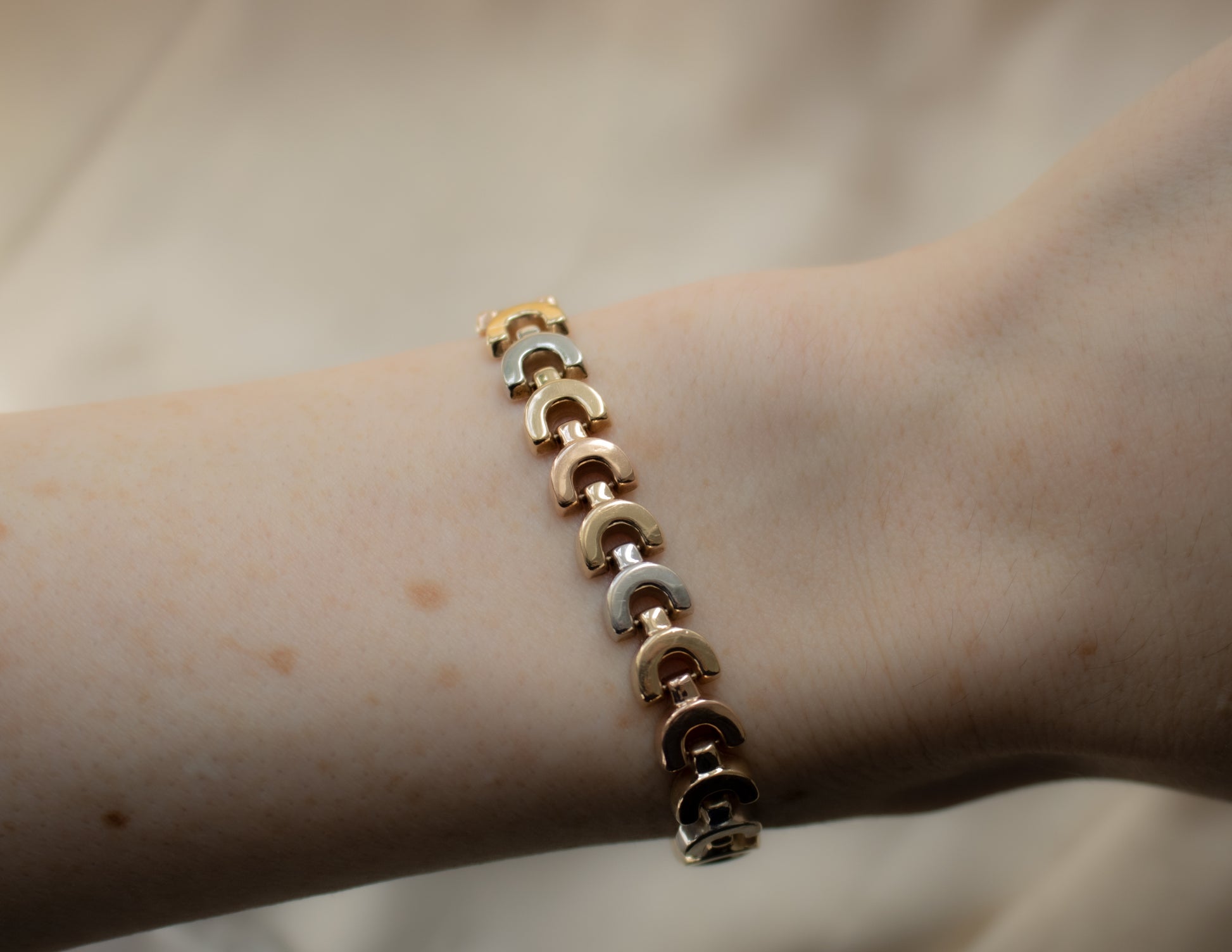The sculptural “C” shaped links create a striking, rhythmic design that sits comfortably and smoothly around the wrist. The contrast between the three gold tones adds depth and versatility, allowing the bracelet to pair effortlessly with other jewellery in mixed metals.