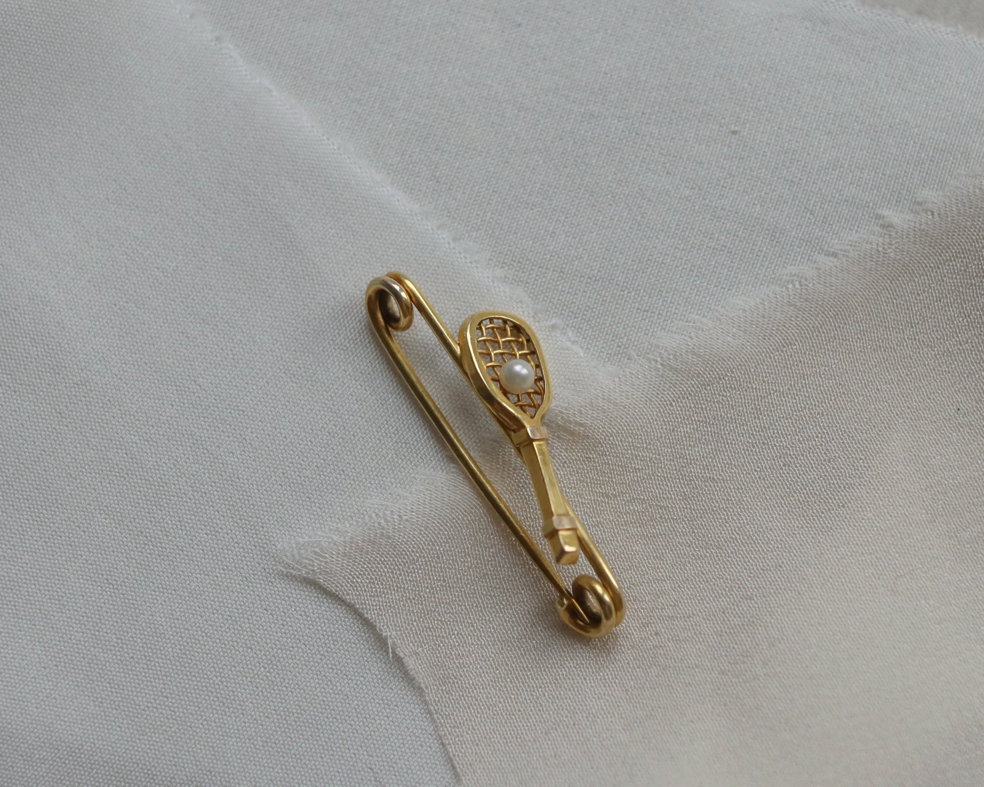 A charming and finely crafted antique novelty brooch, beautifully shaped as a miniature tennis racket and set with a delicate natural pearl representing the ball.