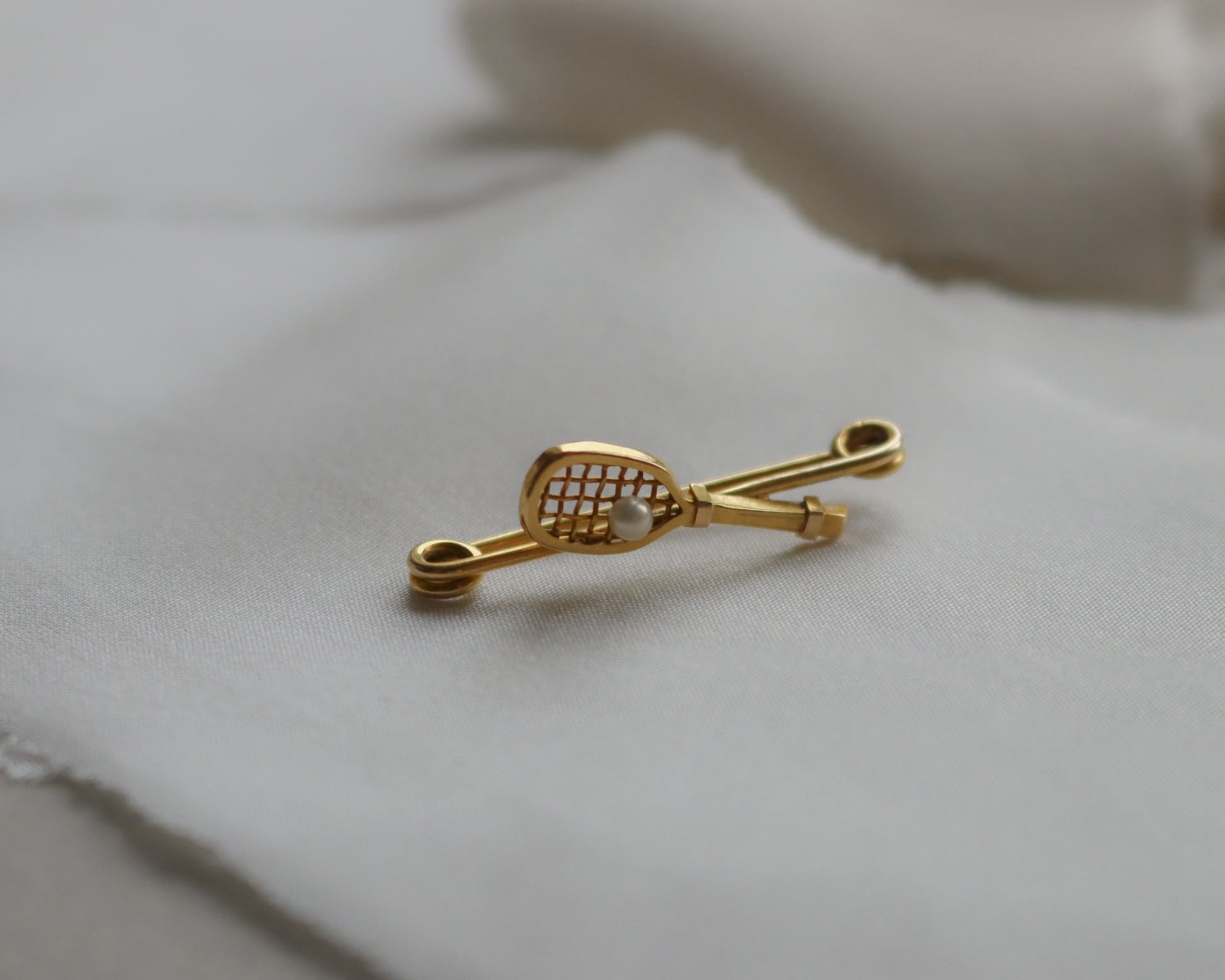 Antique 9ct Gold Tennis Racket Brooch with Natural Pearl