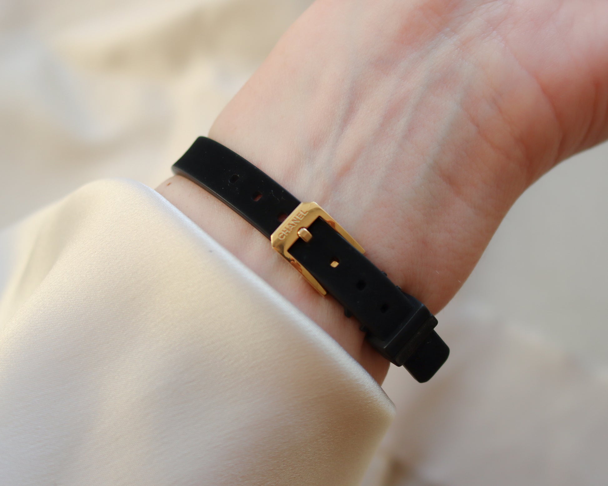 The watch is fitted with a black rubber strap, secured by a solid 18ct gold yellow gold buckle, offering a comfortable and versatile wear that transitions effortlessly from day to evening. Power comes from a reliable Swiss quartz movement, providing precise, low-maintenance timekeeping.