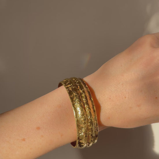 A timeless and characterful example of vintage gold jewellery, perfect for collectors or those seeking a distinctive statement bangle with classic charm.