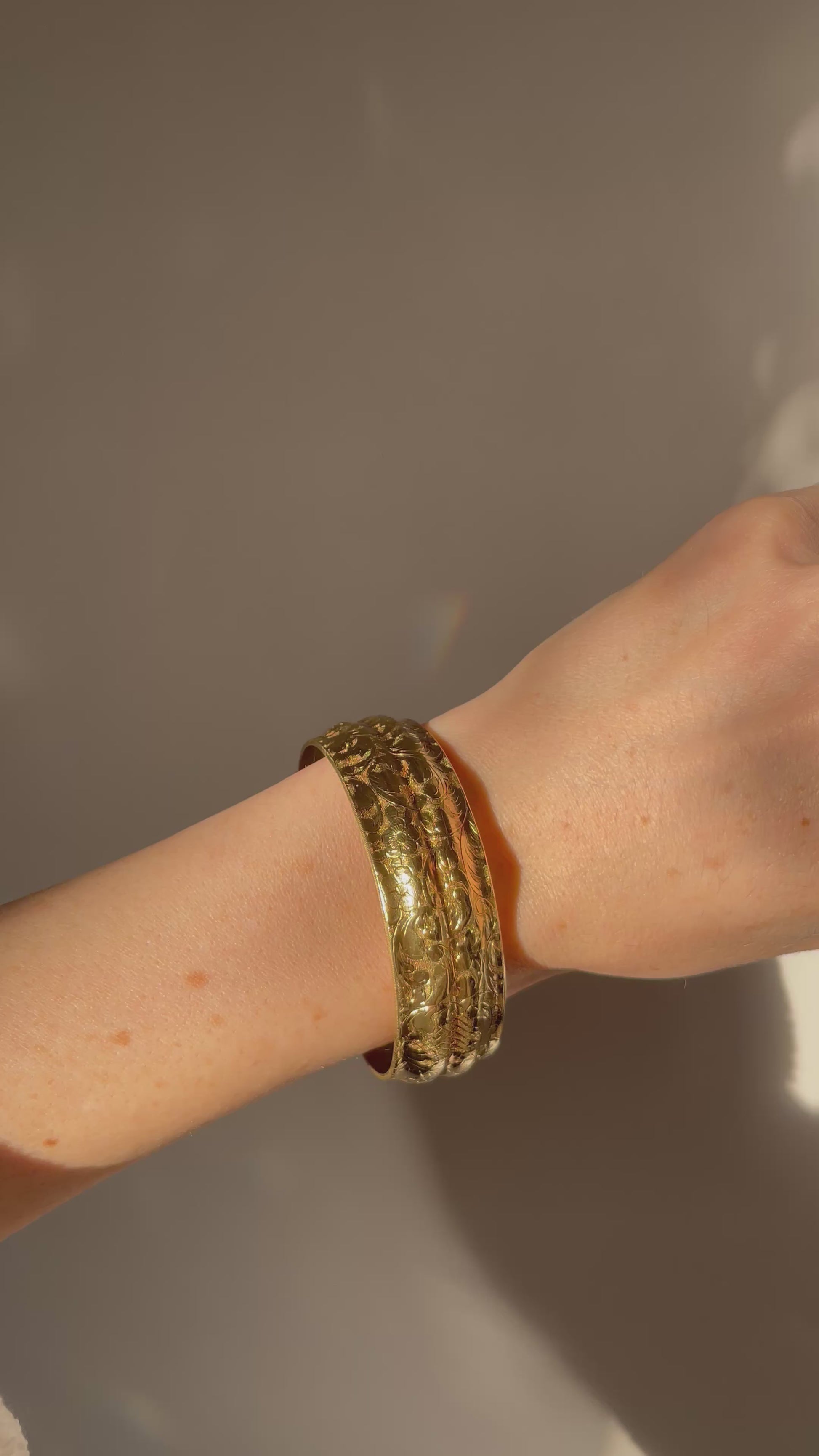 An elegant vintage bangle crafted in warm 14ct gold, beautifully decorated with an intricate foliate engraving that flows seamlessly across the surface. The detailed pattern catches the light and adds depth, cleverly disguising any minor age-related imperfections to the face.