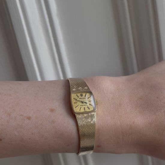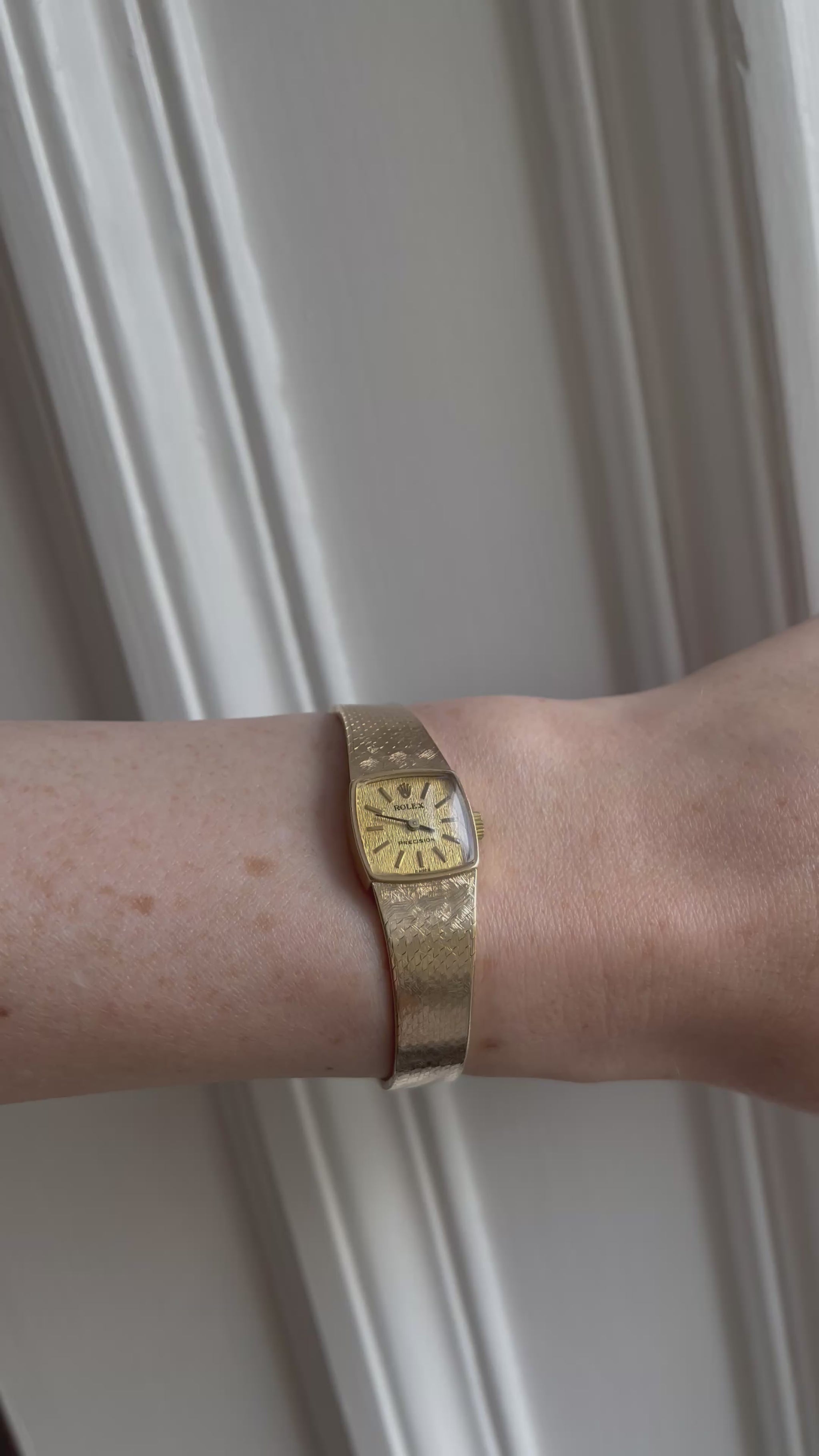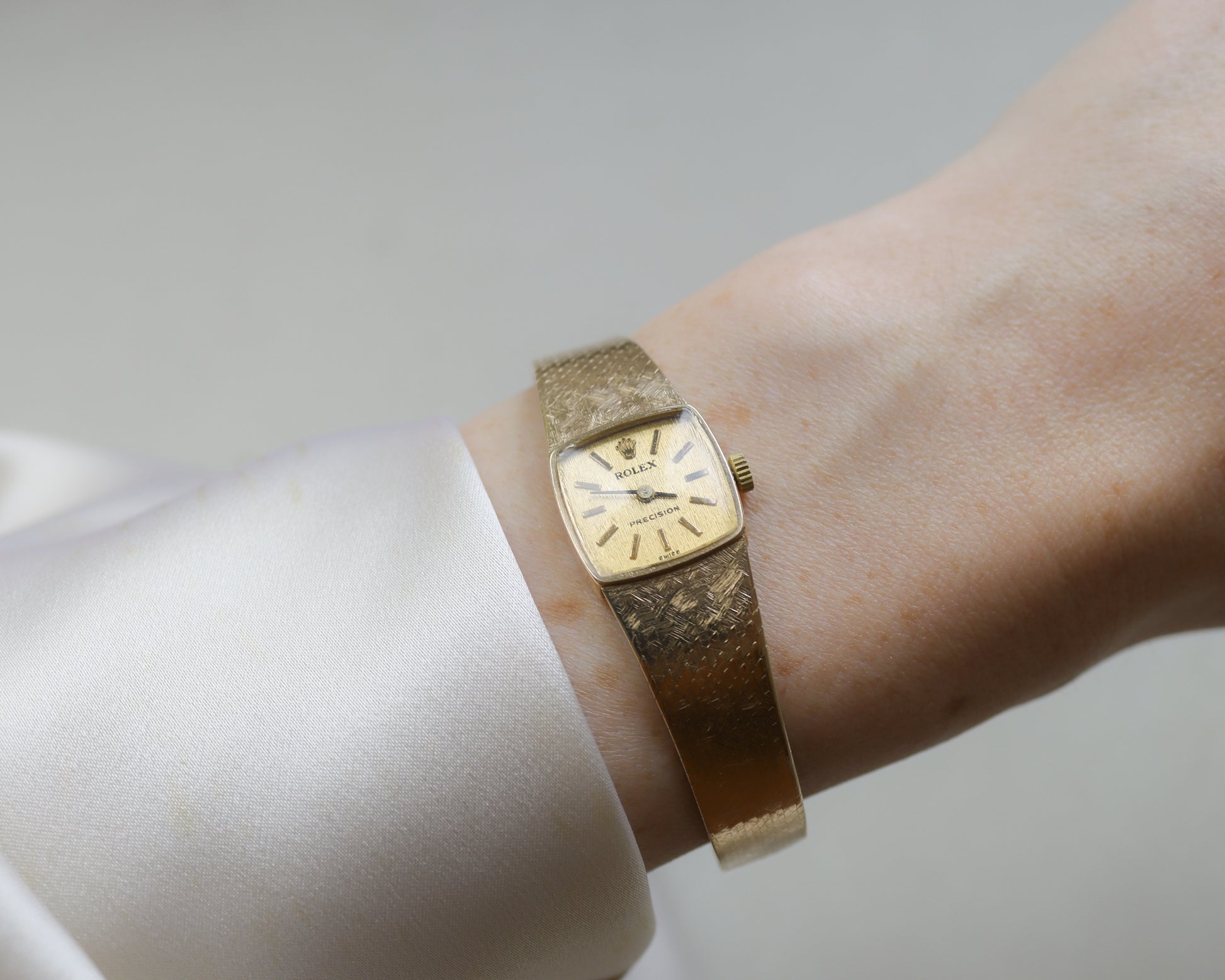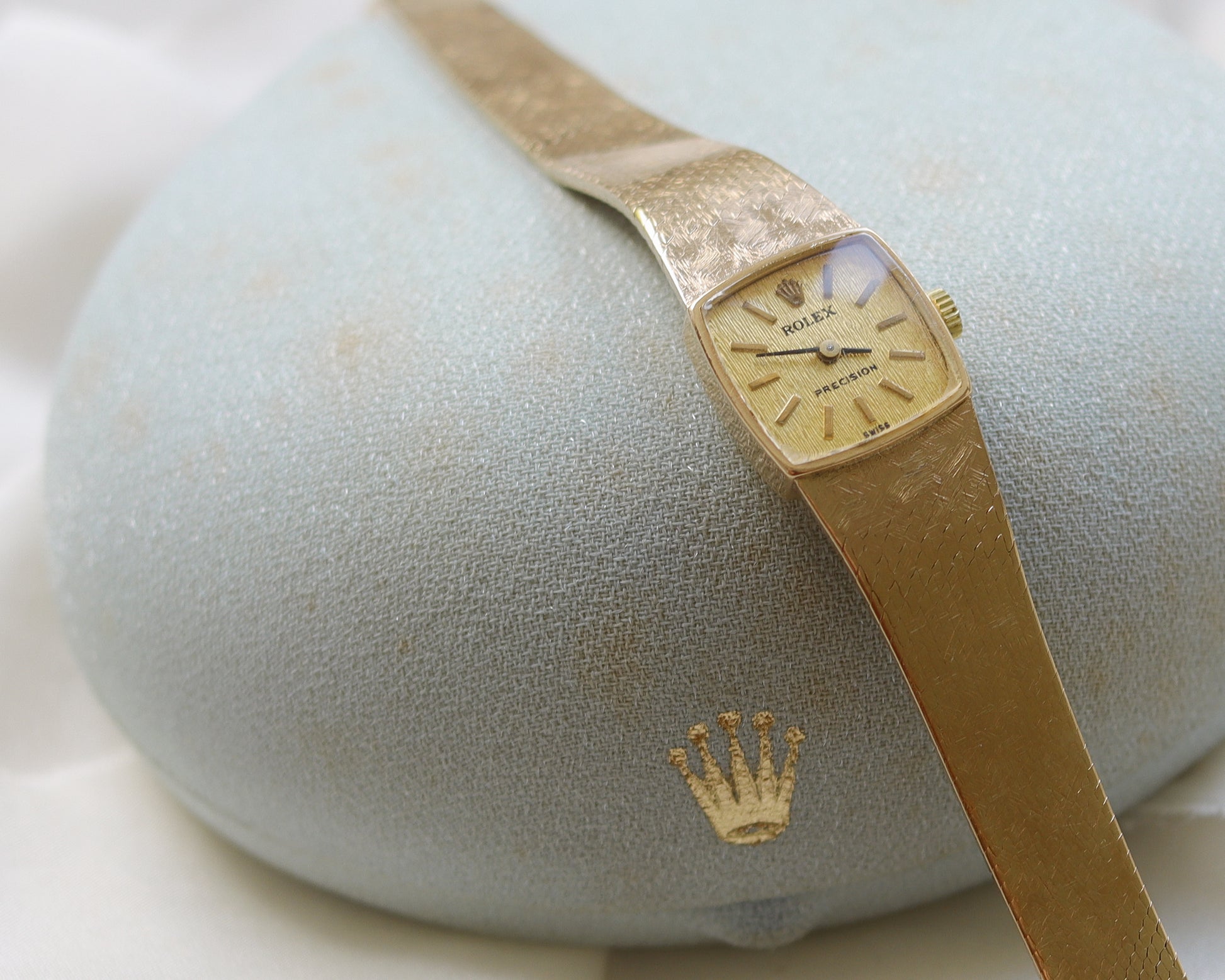 What perfection. This exquisite 14ct gold vintage ladies Rolex Precision watch, is a true gem from the year 1973. Distinguished by its rare squared face and gold textured dial.