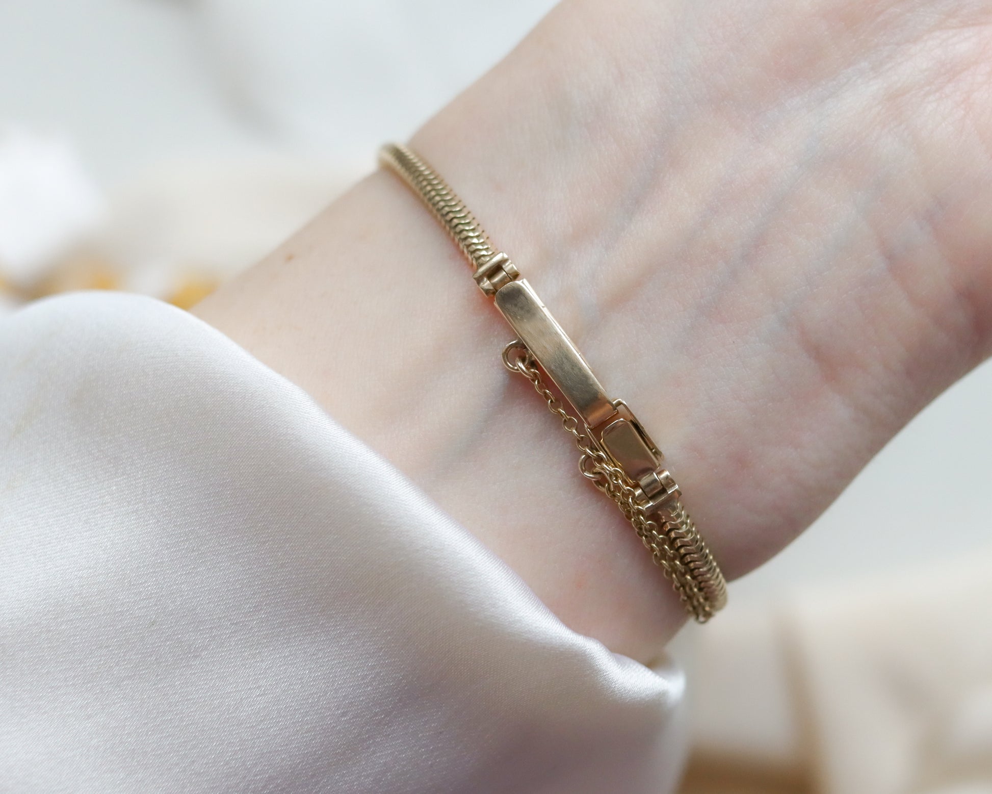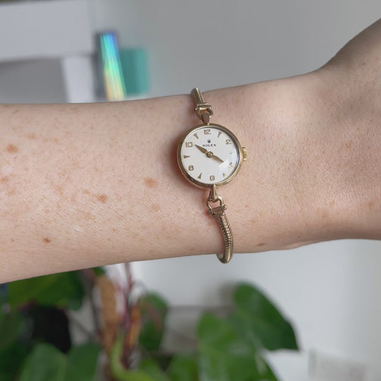 The watch is fitted to a 9ct gold snake link chain bracelet with a snap fastening and safety chain, sitting comfortably on a wrist size of 16.5–17cm. At just 1.8cm across, the face offers refined proportions, making it as versatile as it is stylish.