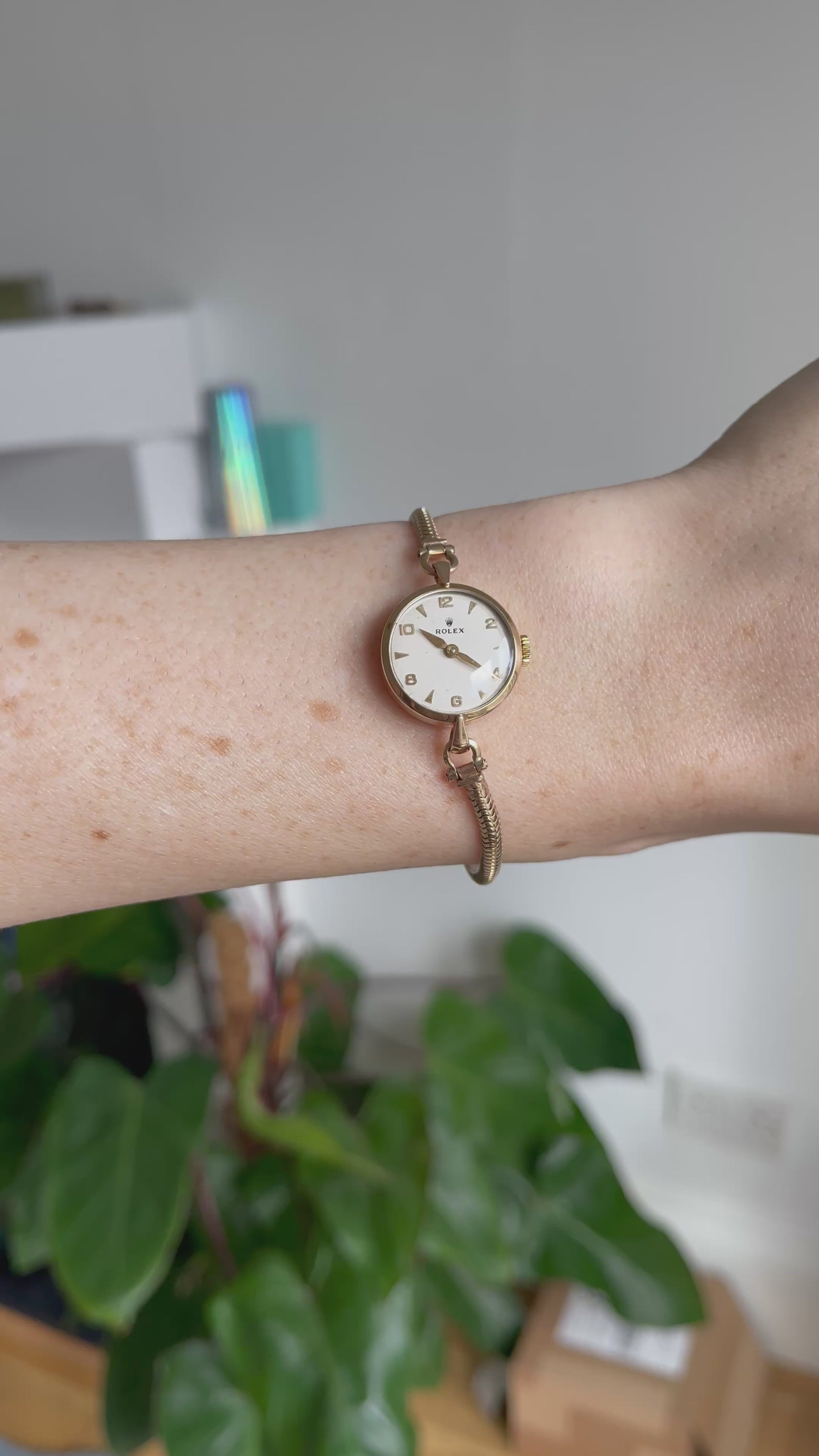 A timeless classic with mid-century charm, this vintage Rolex from 1959 brings together elegance, craftsmanship, and collectability. Crafted in 9ct gold, it features a manual wind precision movement and a crisp white enamel dial, detailed with baton and Arabic numerals for a clean yet characterful look.