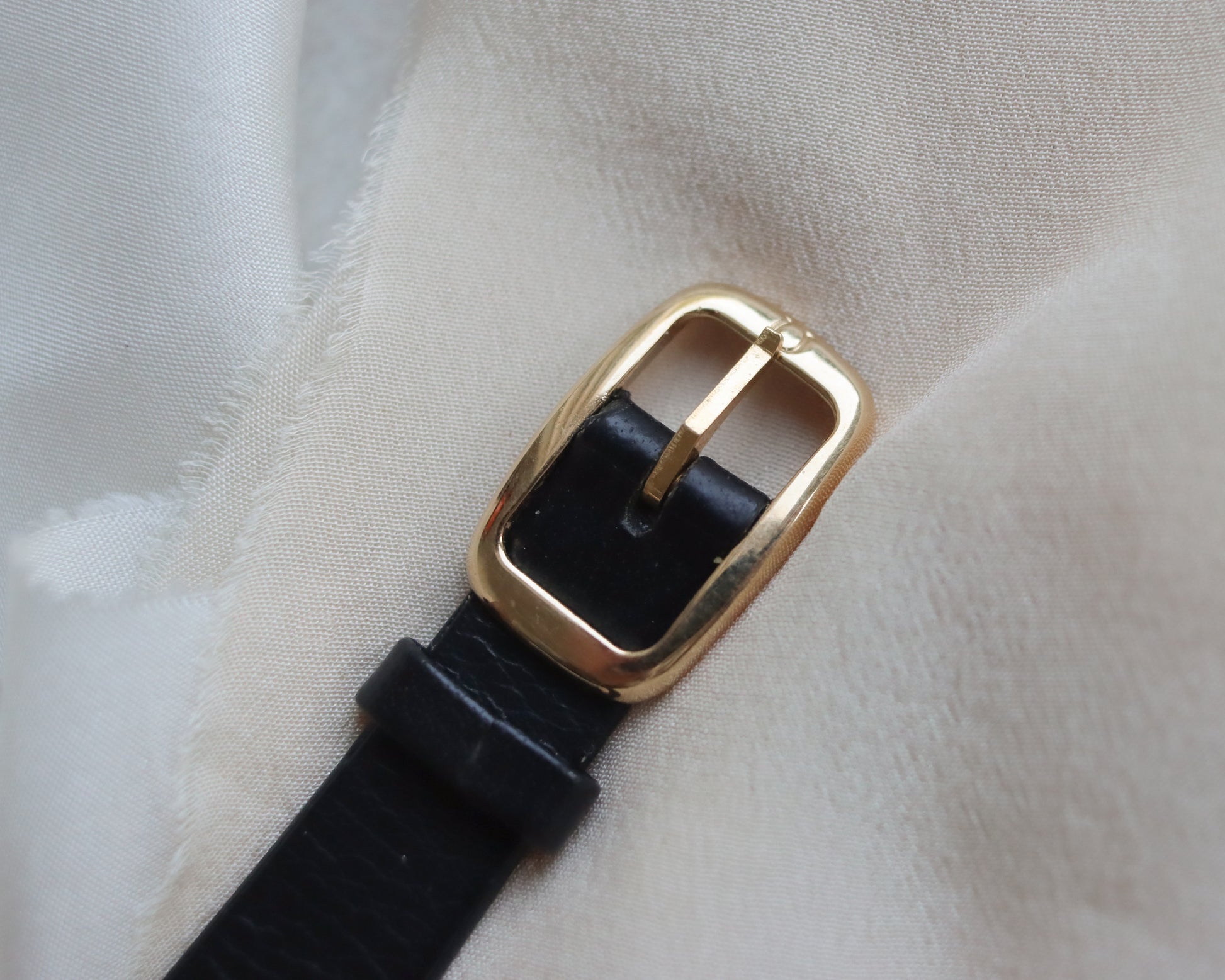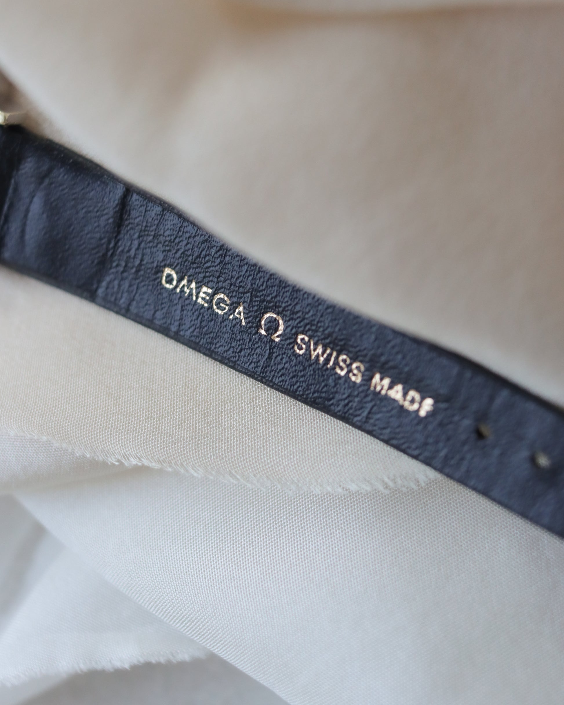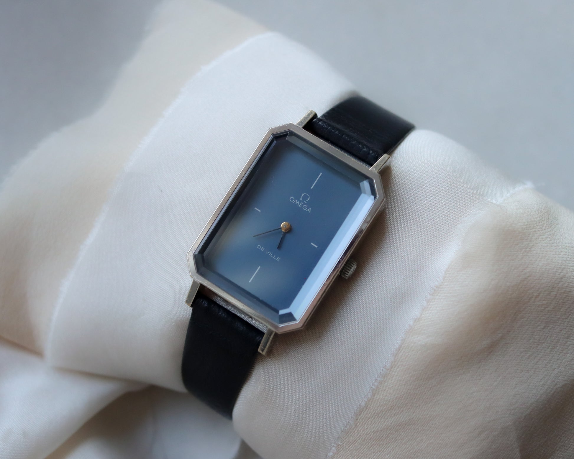 This vintage Omega De Ville Andrew Grima wristwatch from the mid-1970s showcases a timeless design with a stainless steel case finished in white gold plating. Its striking blue dial is complemented by white markers along with black and gold hands, all protected by a faceted crystal in excellent, scratch-free condition. Measuring 24mm, the case offers a versatile unisex fit. The watch is paired with a black leather strap and secured with a gold plaque Omega buckle, highlighting its refined vintage character. Powered by a Swiss-made 1400 manual movement, recently serviced for precision timekeeping, it comes presented in an Omega box.