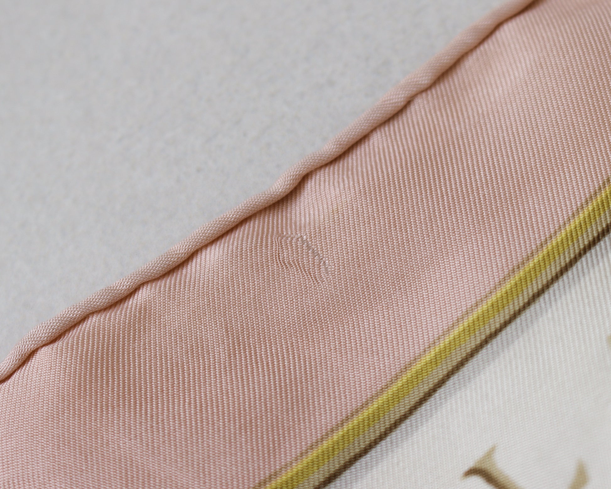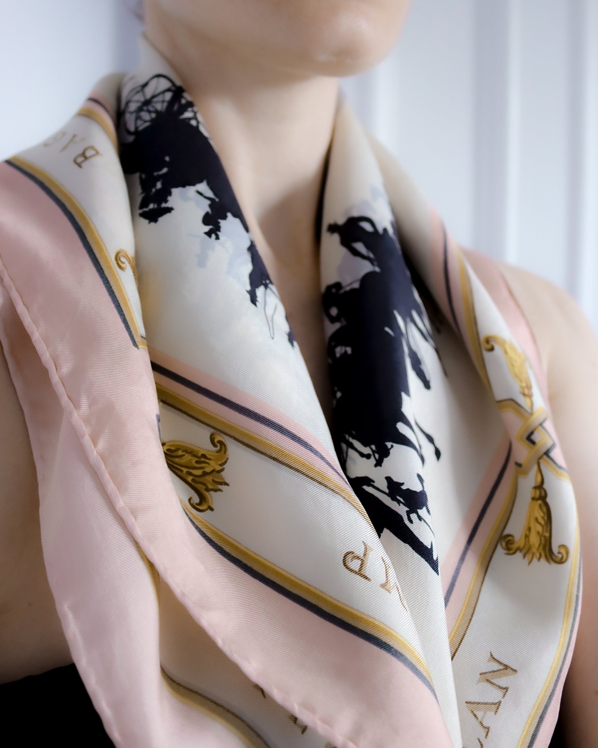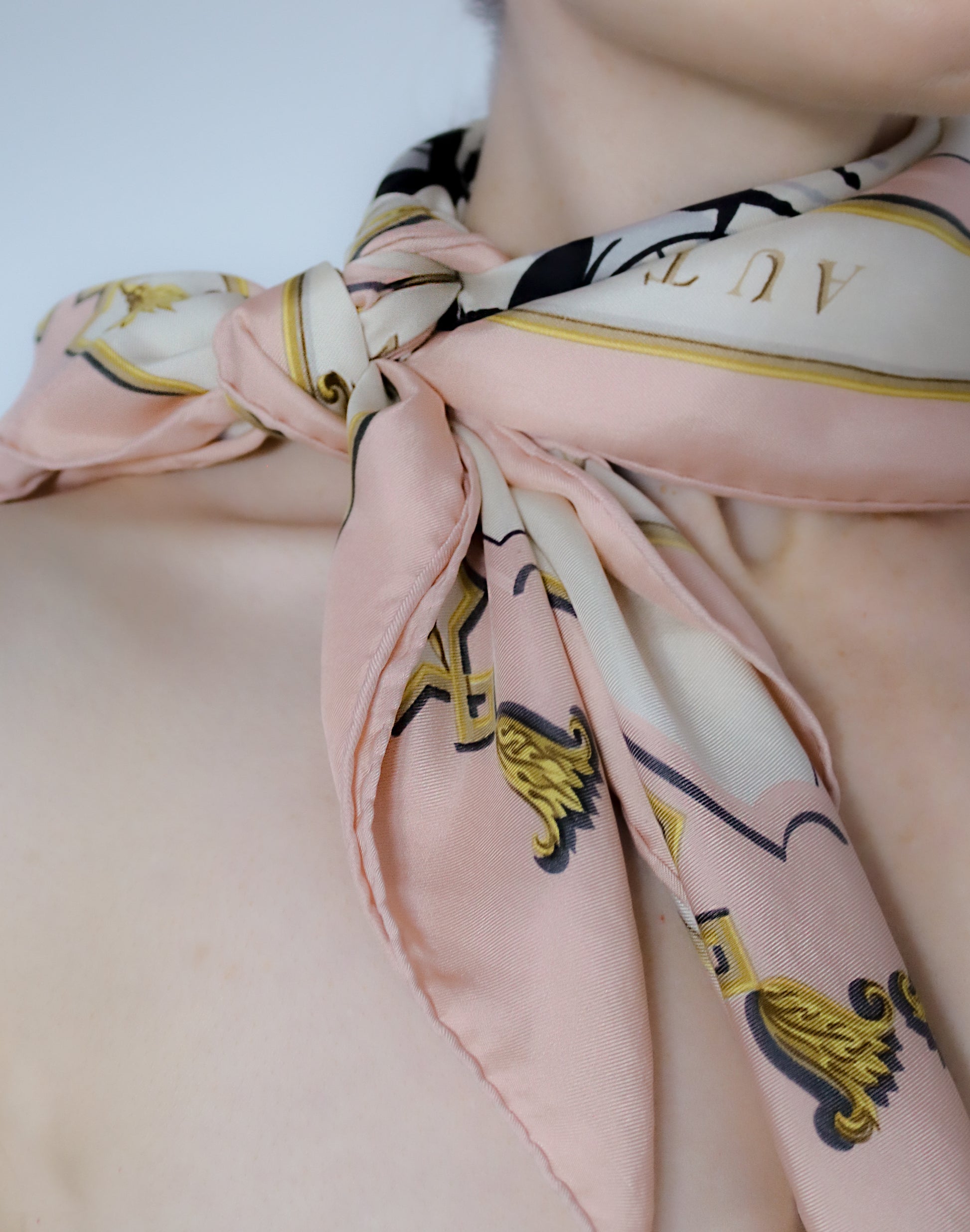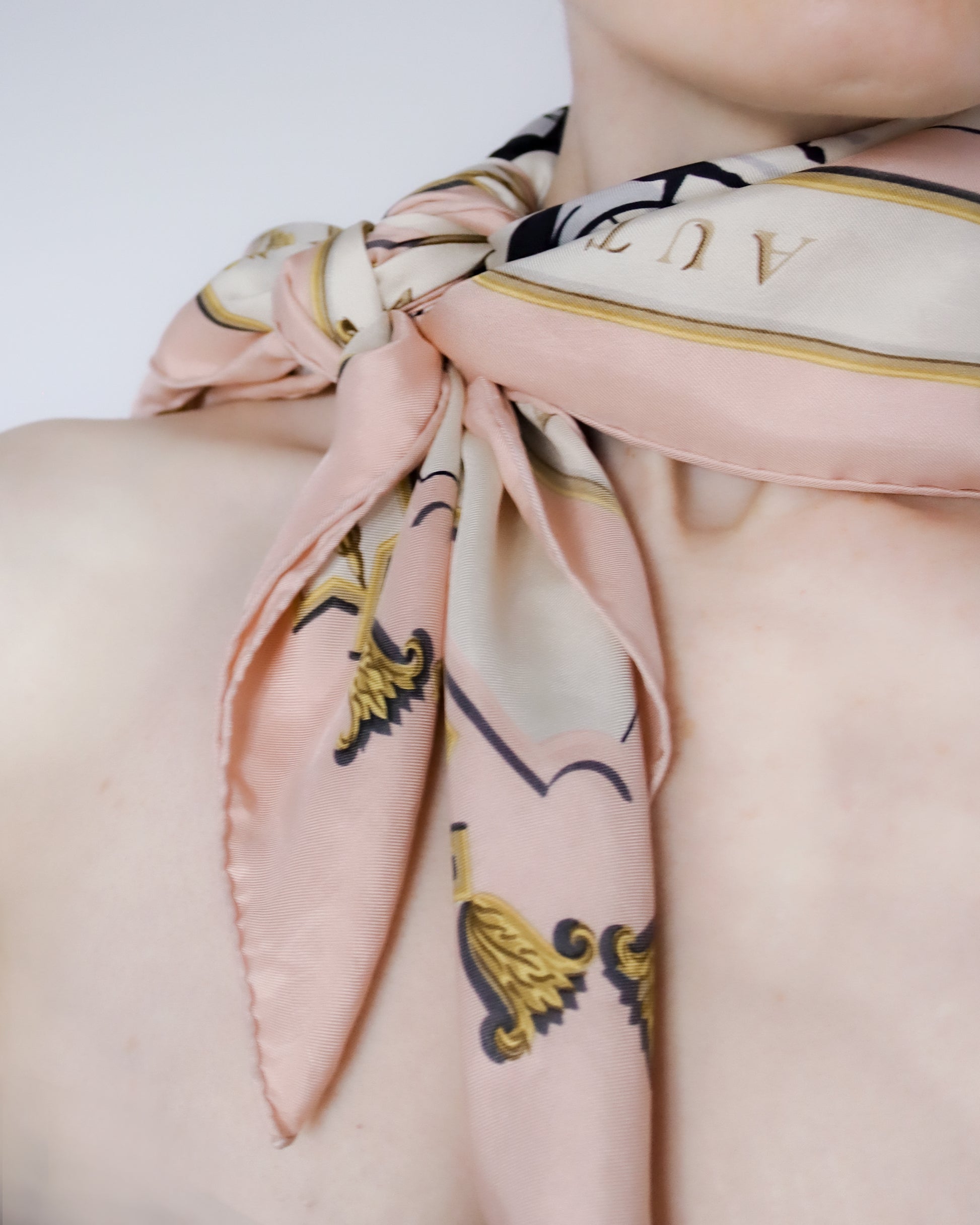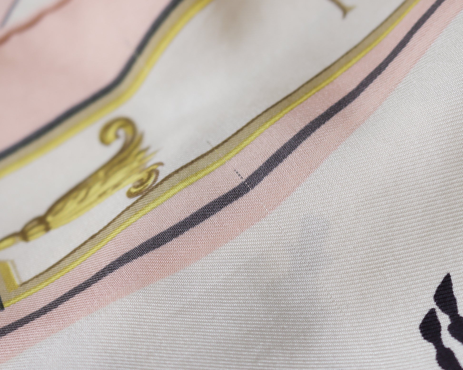 Measuring approximately 85cm x 87cm, this scarf showcases a delicate colour palette of pale pink, yellow, off white, and black—a harmonious blend that exudes sophistication and grace. Despite its age, it remains in remarkably good condition with a few marks and pulls that only add to its vintage charm.