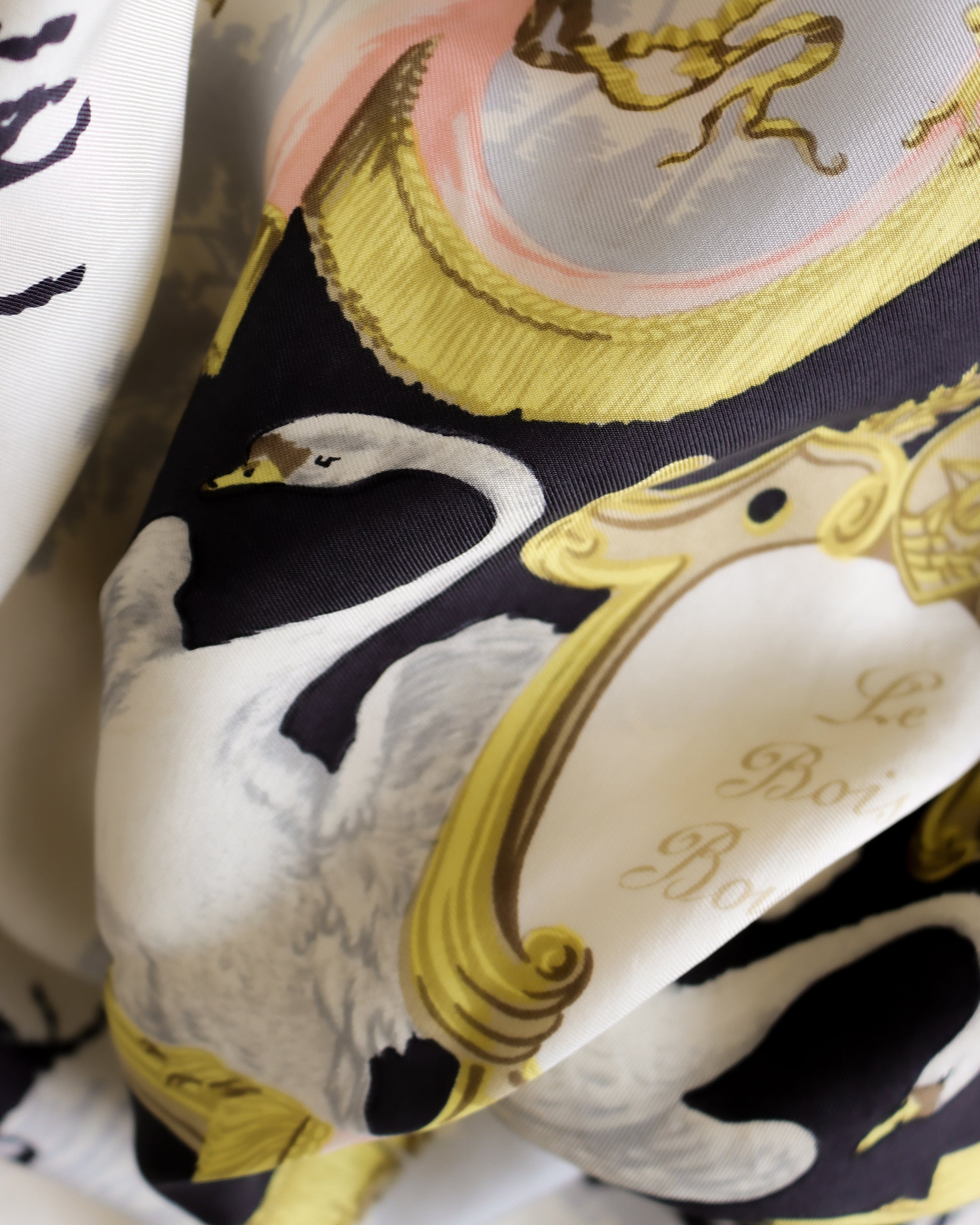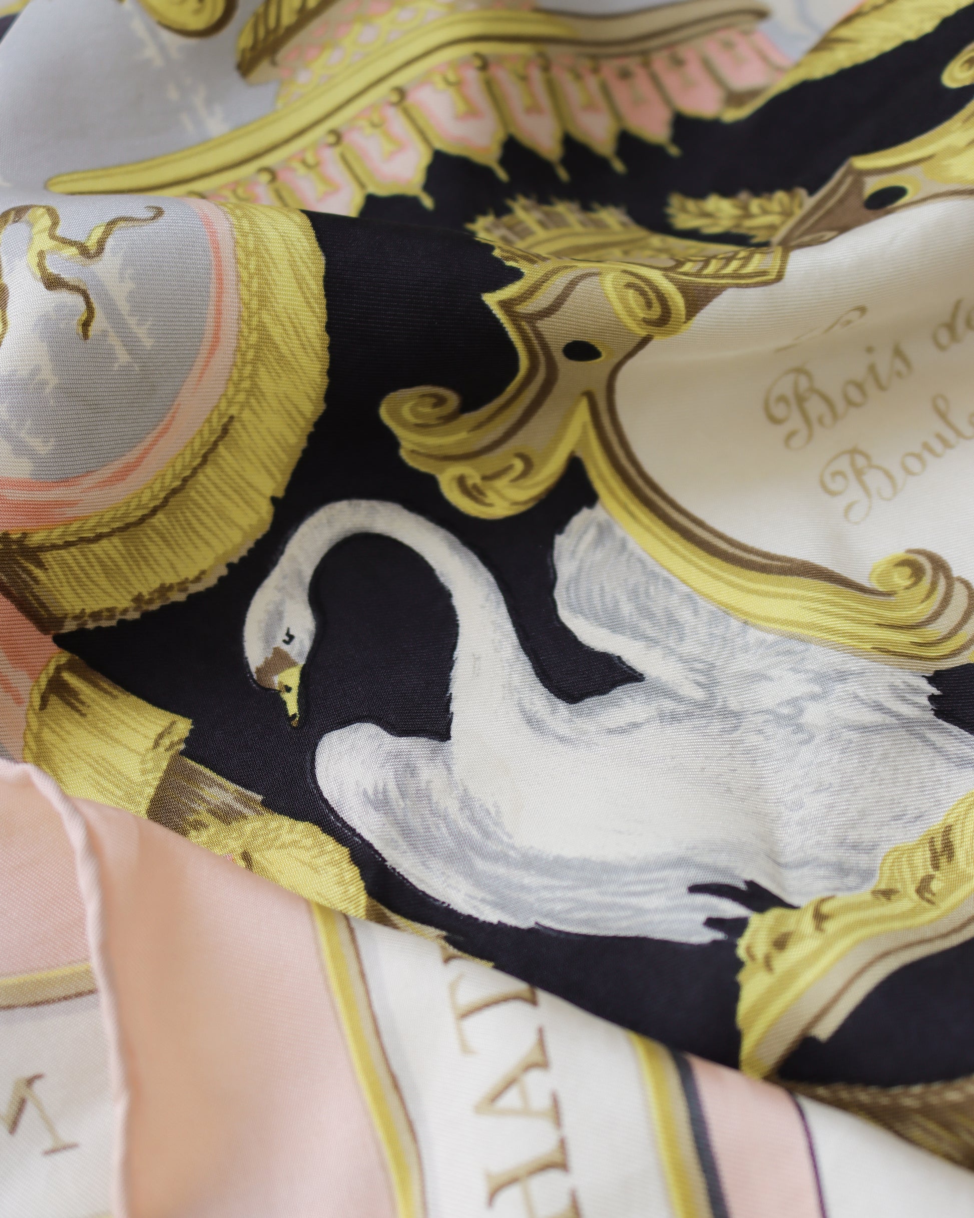Dating back to 1957, this scarf is likely from the original issue due to the distinctive black background behind the swans—an important detail for collectors and enthusiasts alike. Owning this piece allows you not only to embrace its timeless beauty but also become part of Hermes' rich legacy.