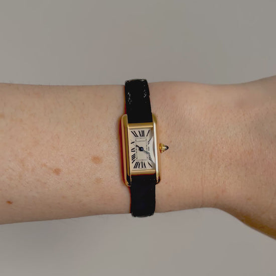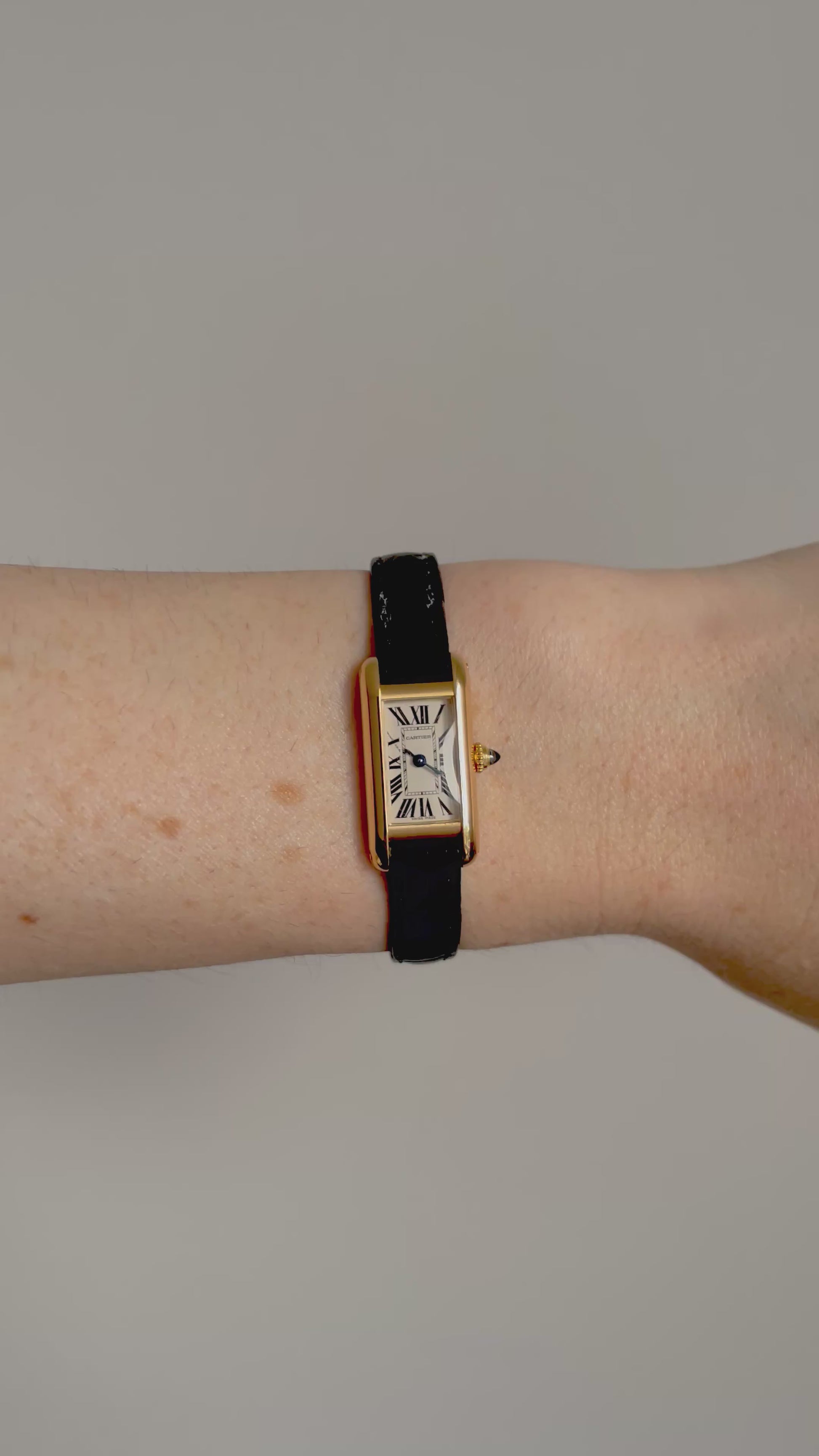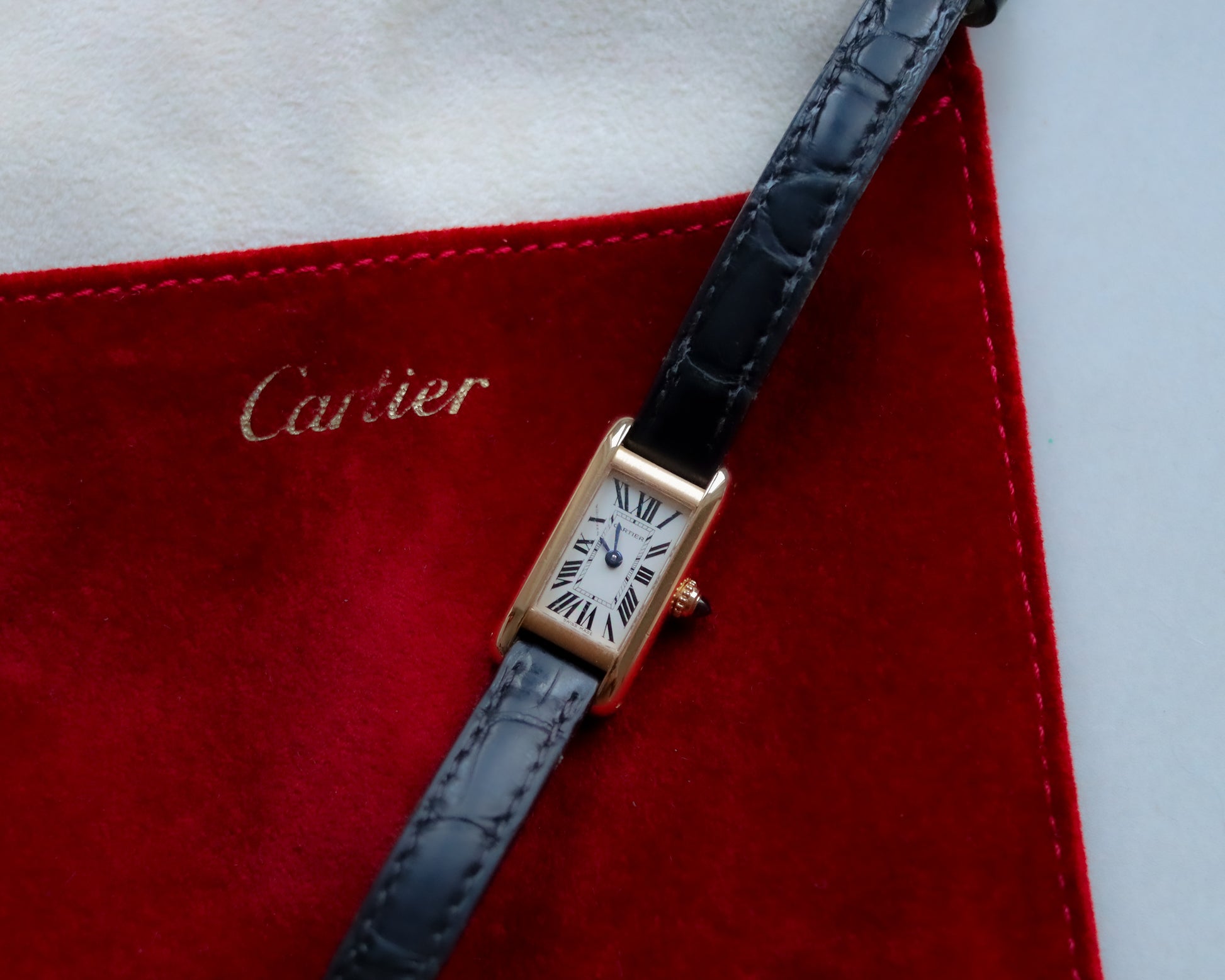 Presented with Cartier’s signature elegance, it features a silvered dial with classic Roman numerals and the discreet Cartier secret signature at X, all powered by a precise quartz movement.