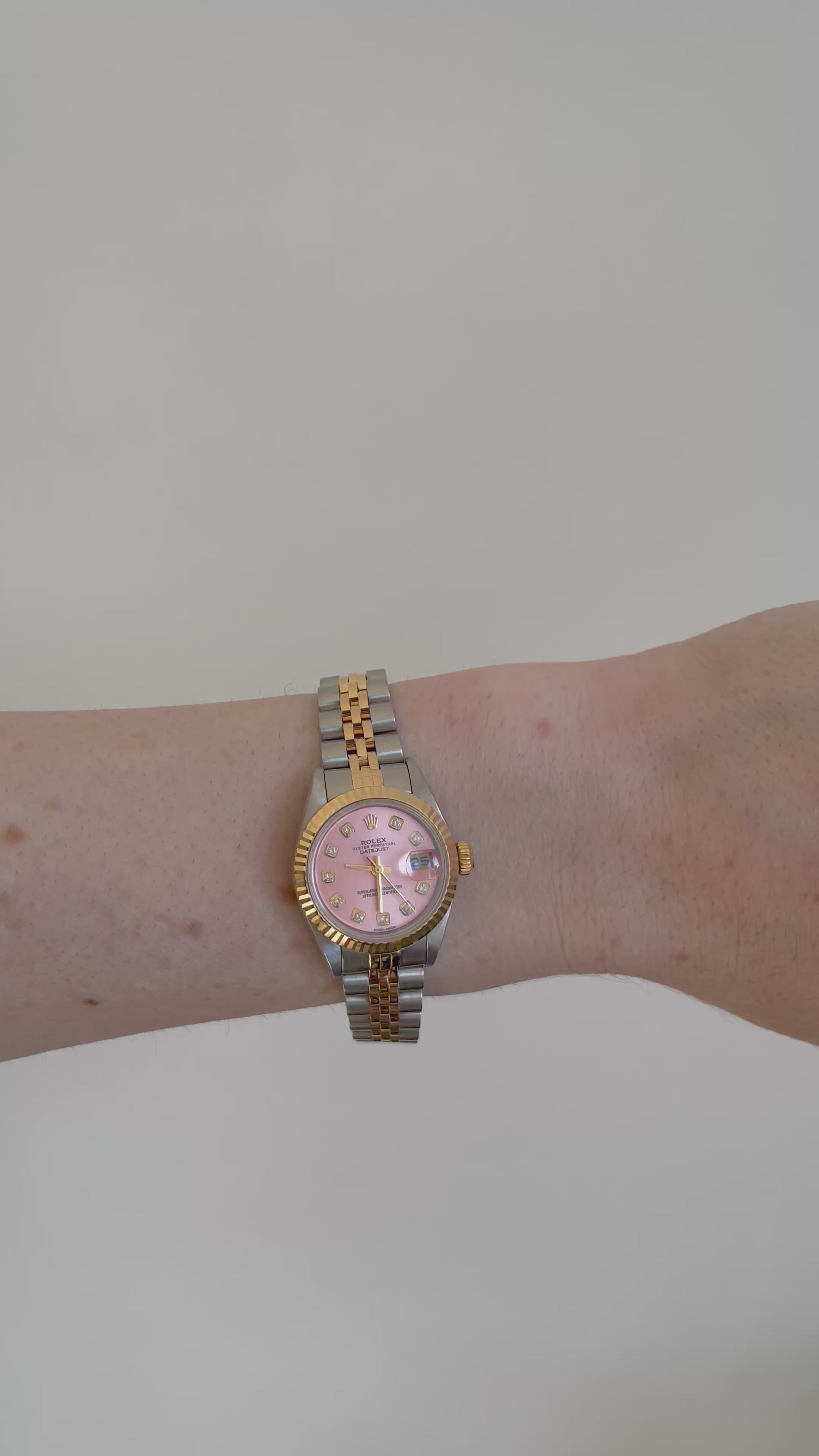 - Dial: Custom pink sunburst Oyster Perpetual