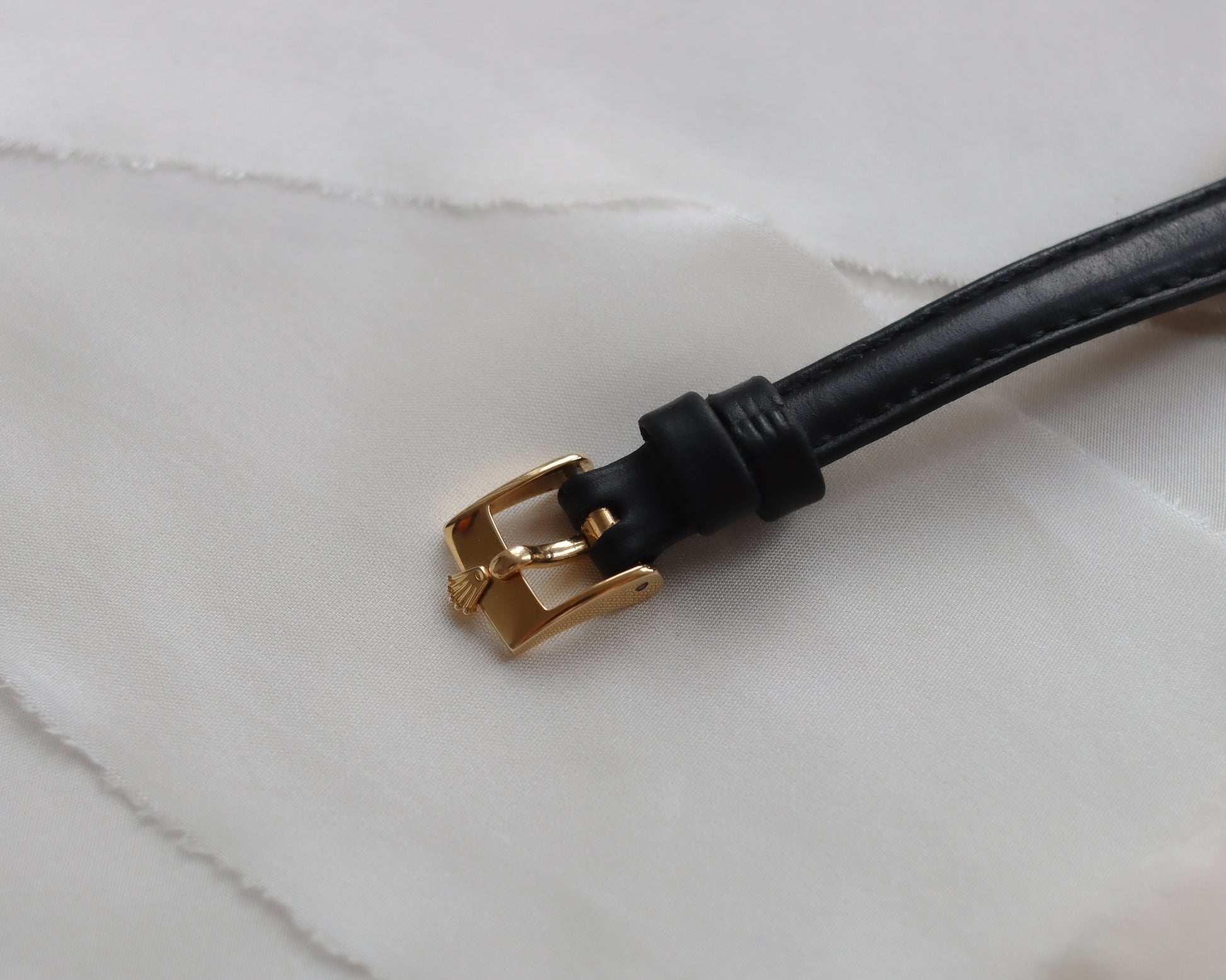 This elegant vintage Rolex Precision 2123 is crafted in solid 18ct yellow gold, featuring a refined 22mm case with a beautifully etched dial design. The gold dial is accented with black and gold baton markers, showing light wear consistent with age. Its manual winding movement runs excellently, recently serviced for reliable performance. The watch is paired with a classic black leather strap and finished with a Rolex gold plaque buckle. The crystal remains in good condition with only minor scratches. Produced circa 1964, this timeless piece comes presented in a Rolex box.