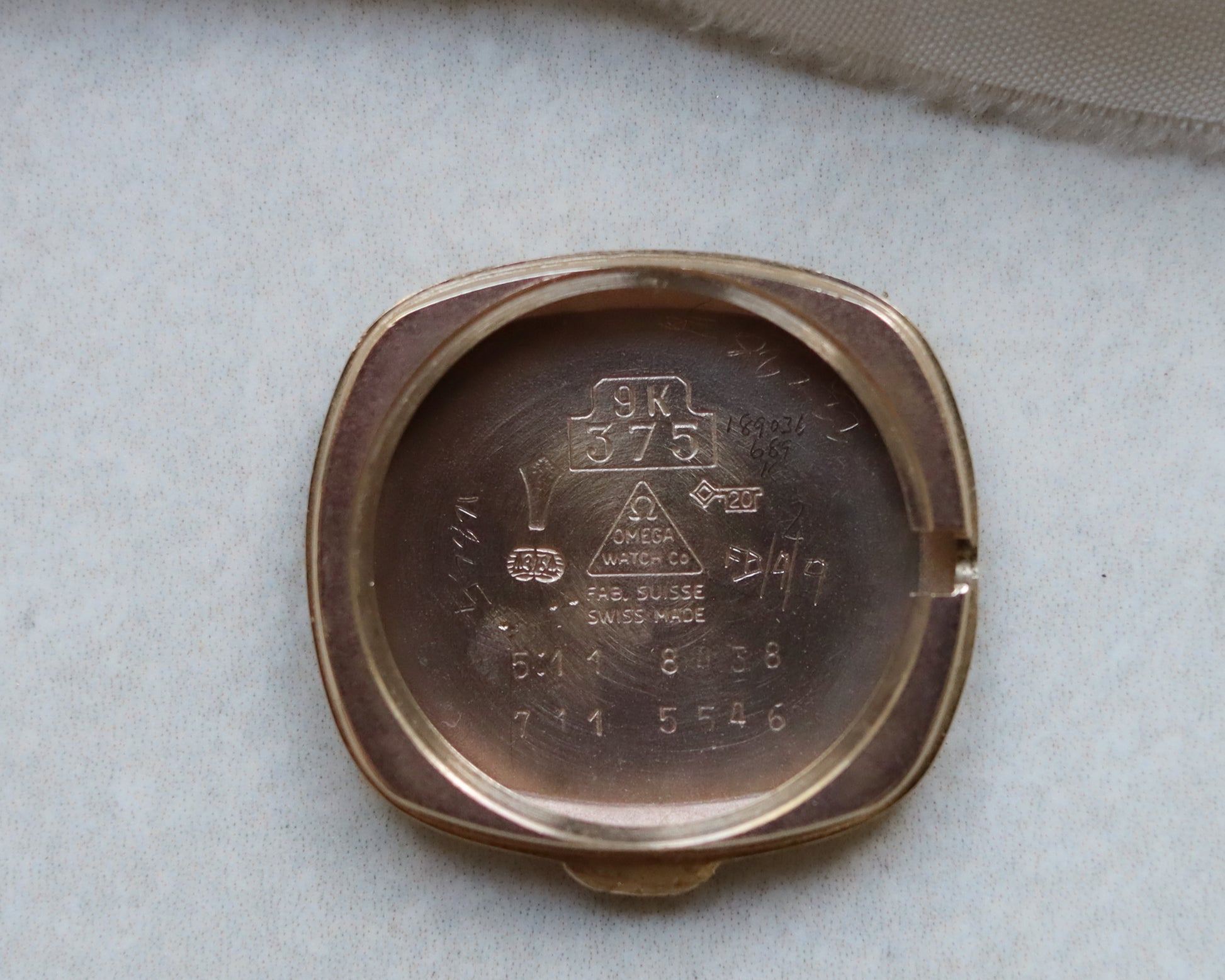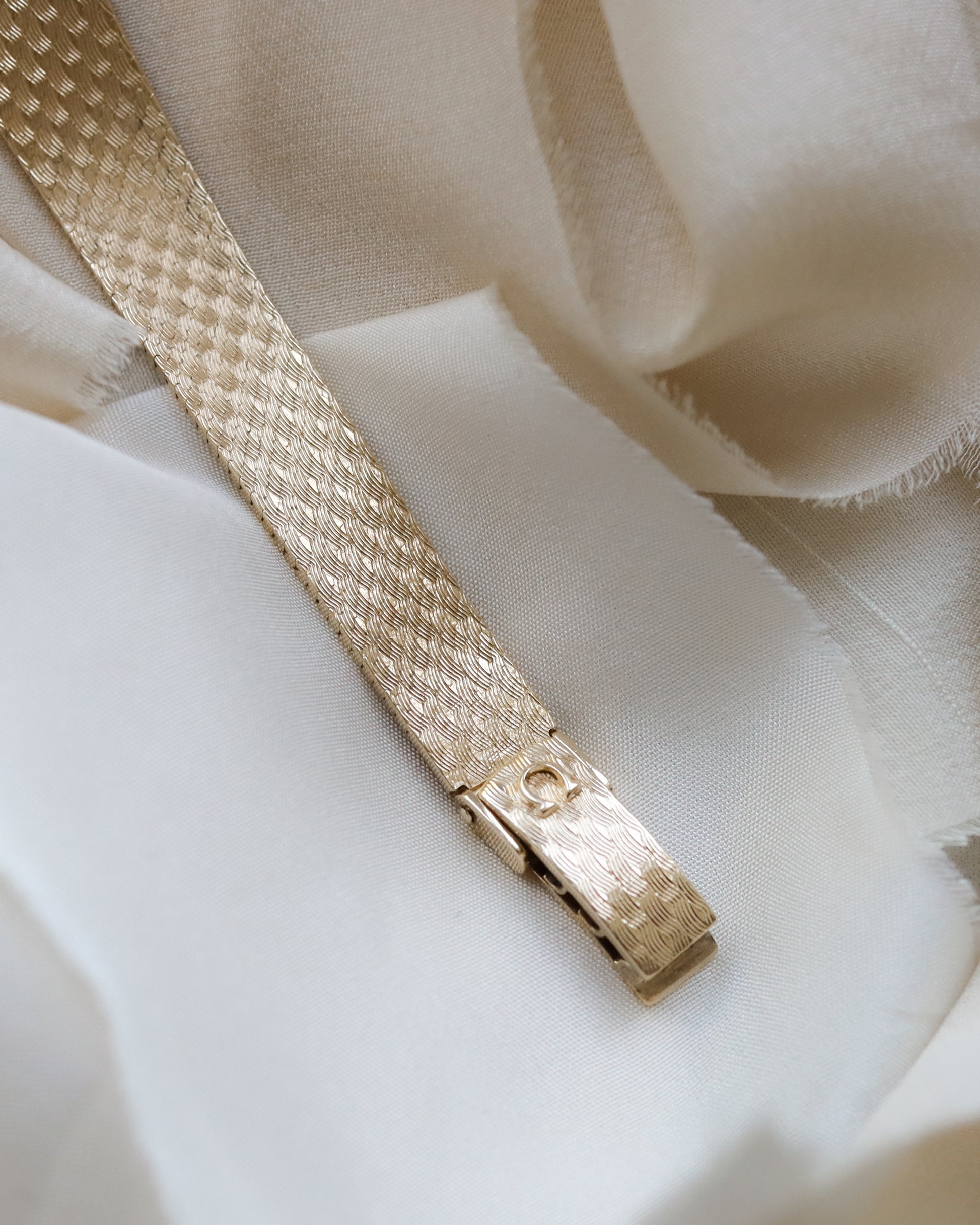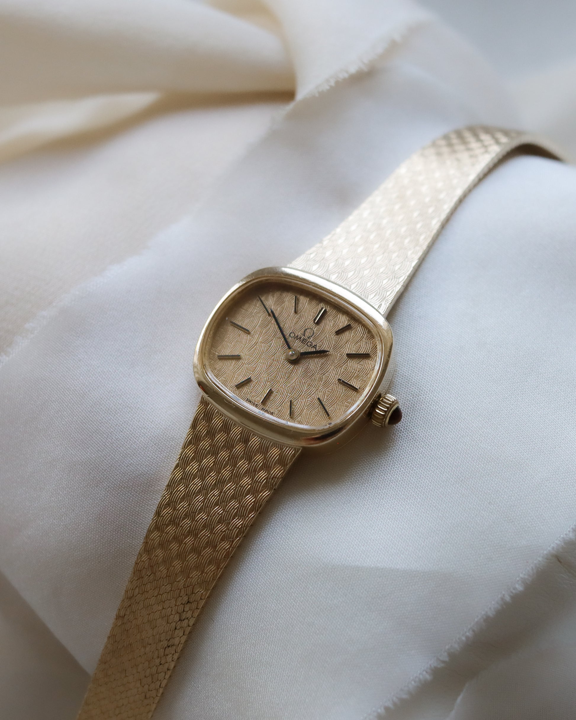 This 1978 watch is fitted to an integral 9ct gold Omega bracelet, seamlessly patterned to complement the gold-toned dial with matching baton markers and black on gold-toned hands. A fine example of vintage Omega design.