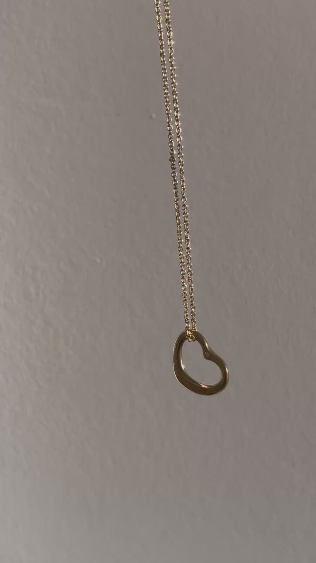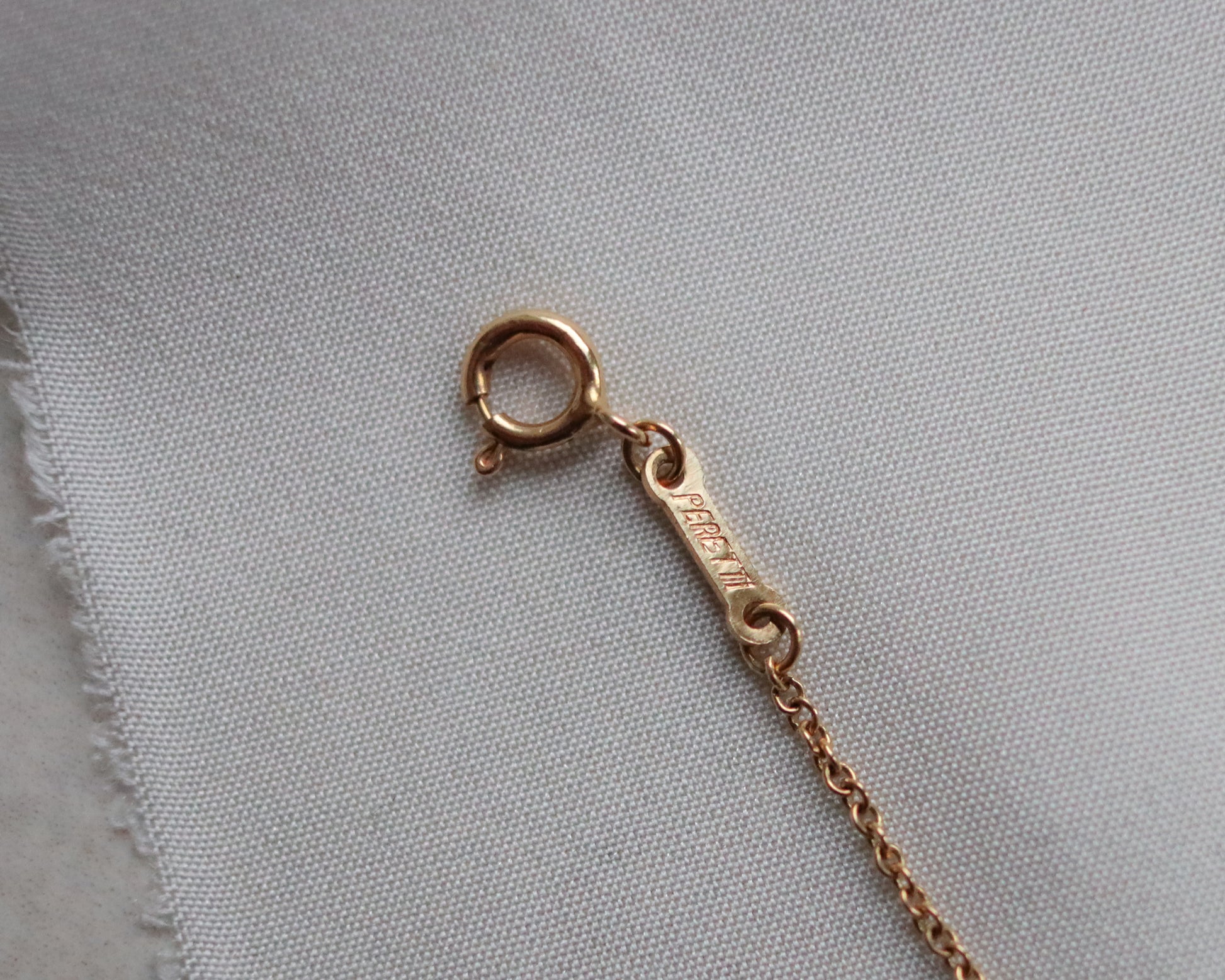 The pendant is finely engraved with “TIFFANY & CO. PERETTI 750 © SPAIN,” confirming both its provenance and gold purity, and it hangs beautifully from a 40.5 cm (16-inch) Tiffany chain that sits elegantly at the collarbone.