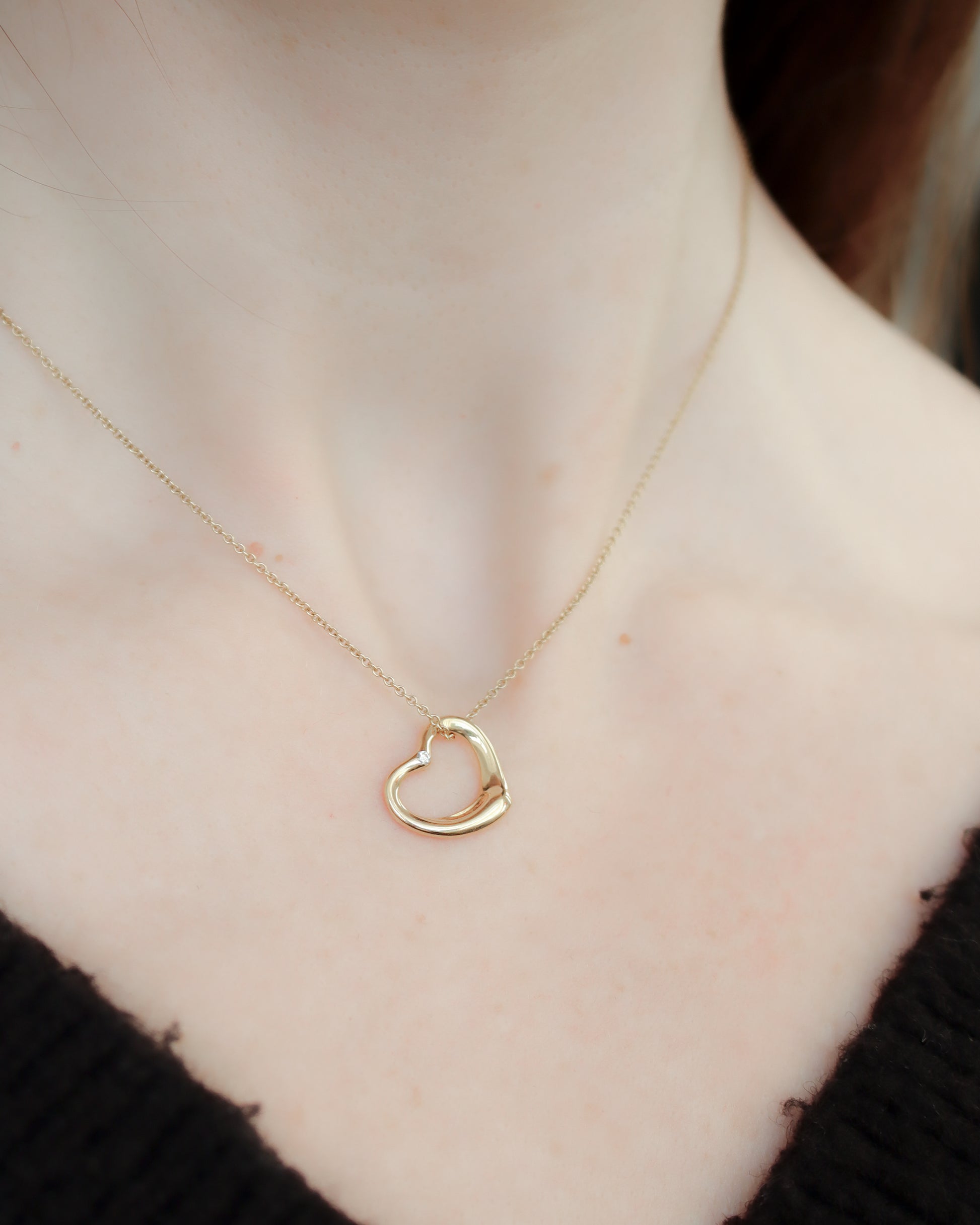 This is a classic late 1990's Tiffany & Co. Elsa Peretti Open Heart Necklace crafted in rich 18k yellow gold and finished with a delicate diamond accent.