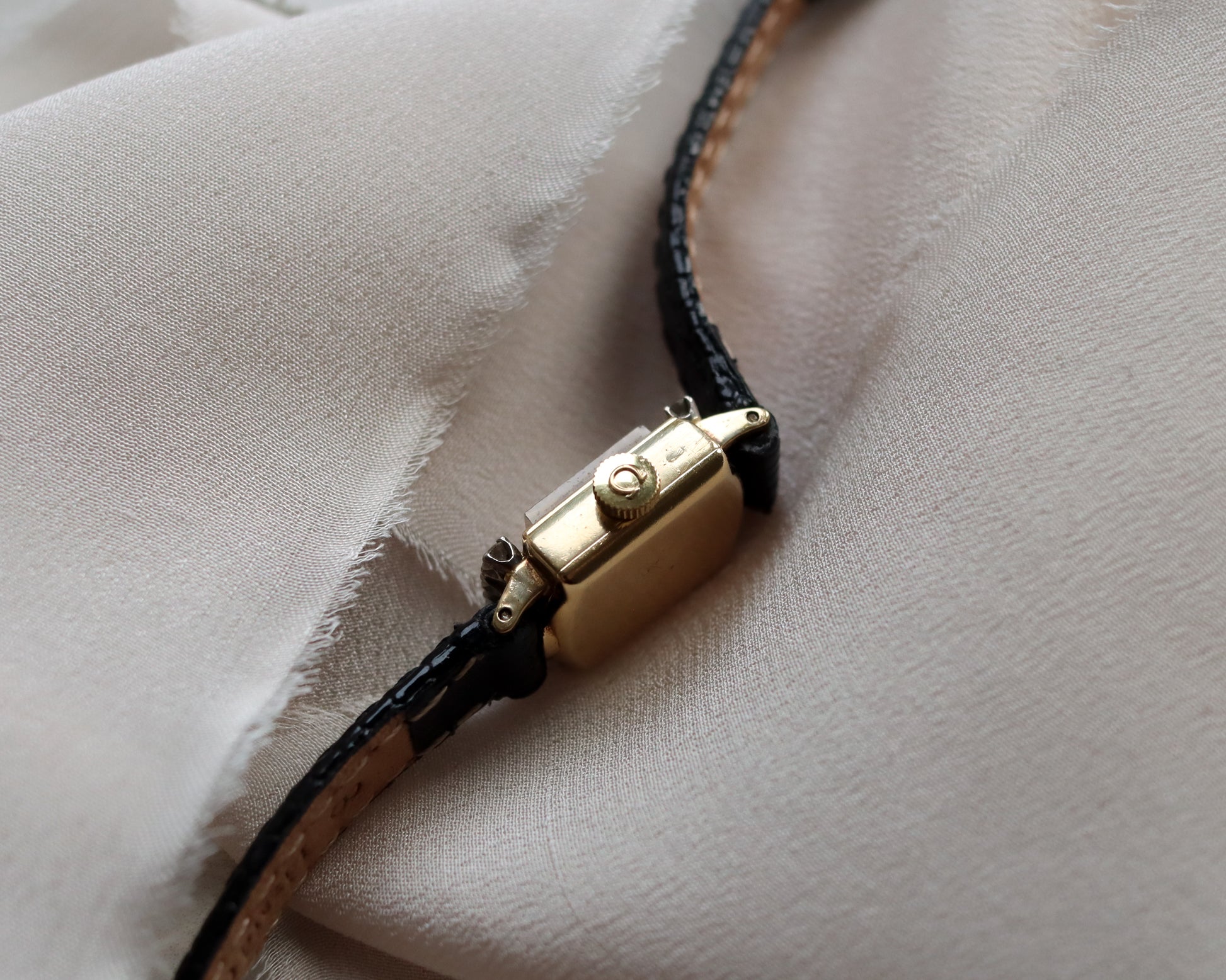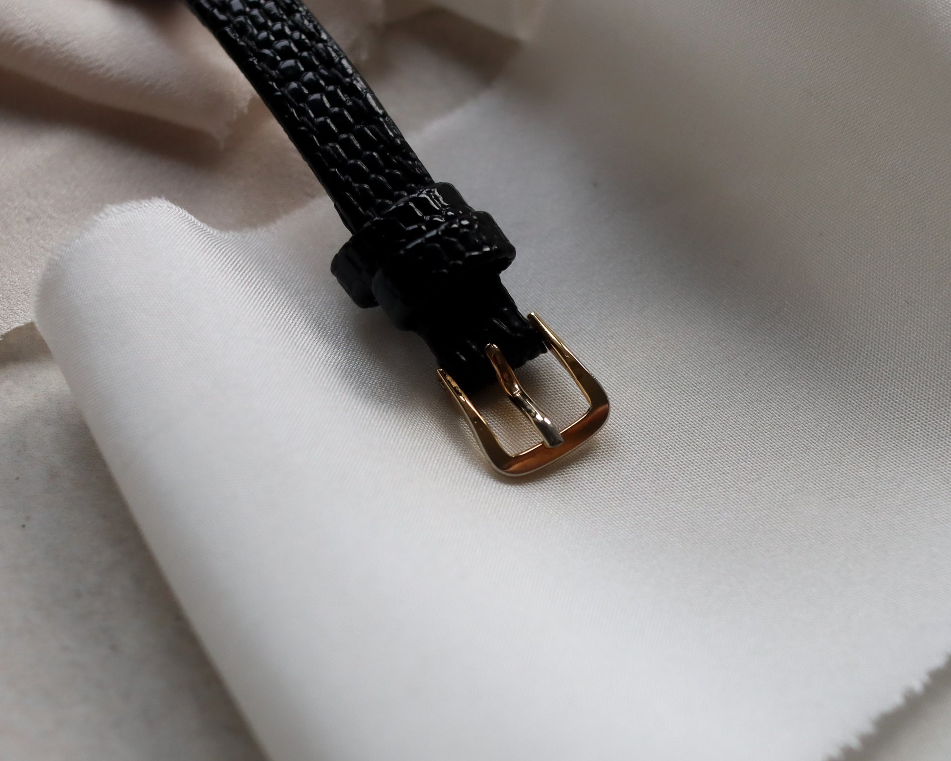 The delicate 13mm case houses a manual wind movement that is currently functioning and has been fully serviced for reliability. Its beautifully preserved patent textured strap adds vintage charm and complements the gold case perfectly. Weighing approximately 11.6 grams overall, this piece feels both luxurious and refined on the wrist.