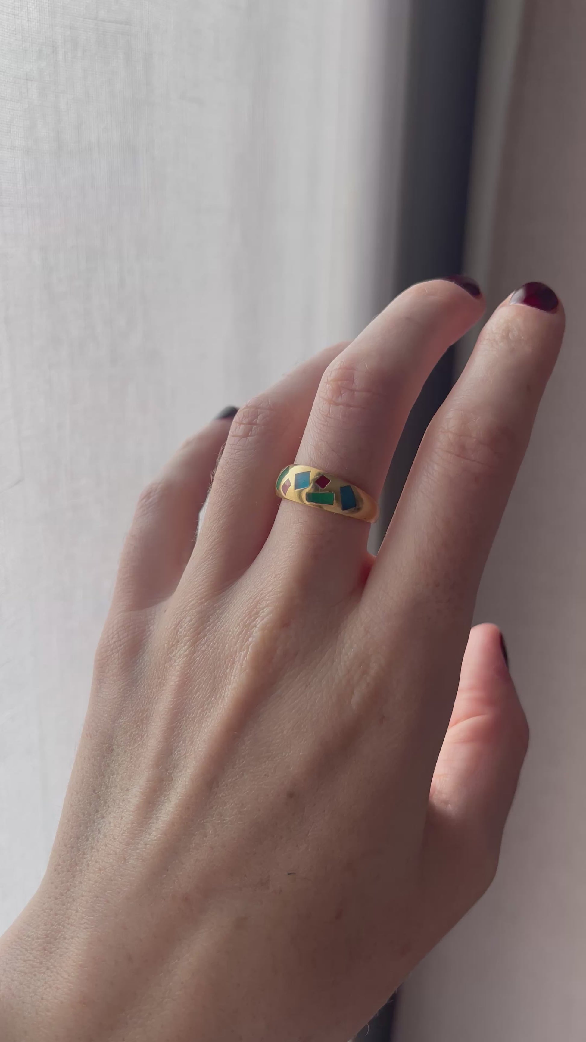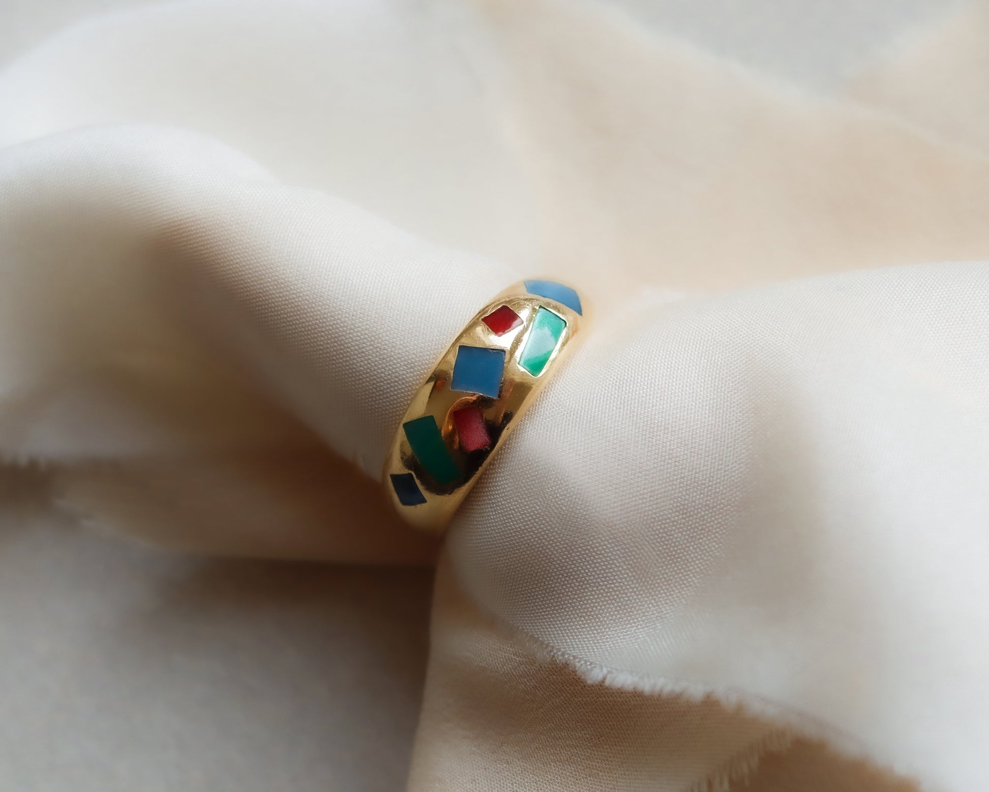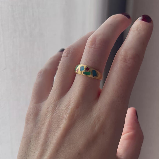 A striking vintage 18ct gold gypsy-style ring showcasing a bold and artistic design. The face features an intricate geometric pattern in rich green, red, and blue gemstone — a beautiful fusion of colour and craftsmanship that captures the elegance of vintage jewellery.