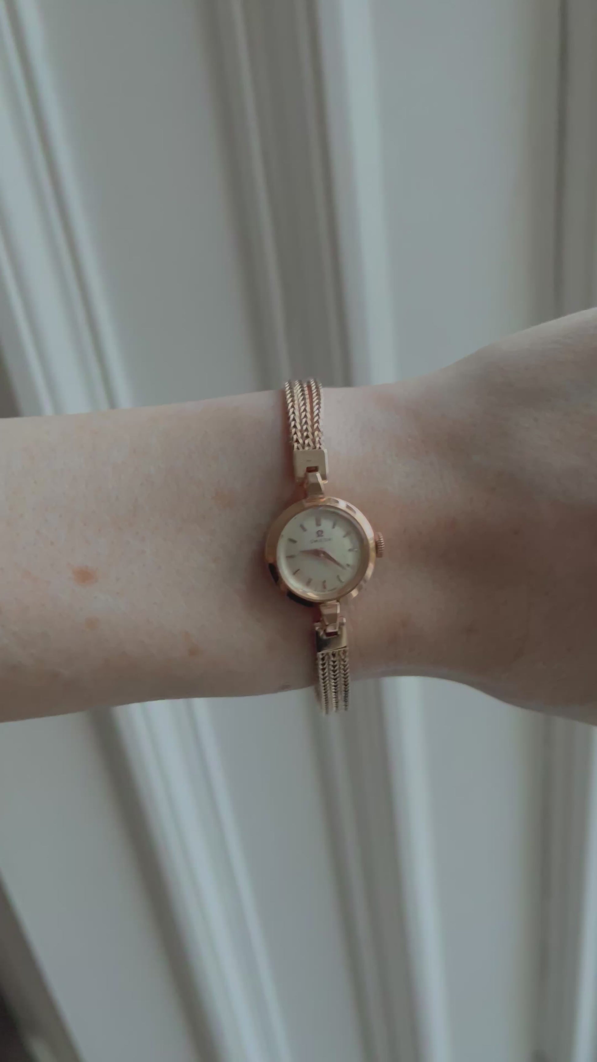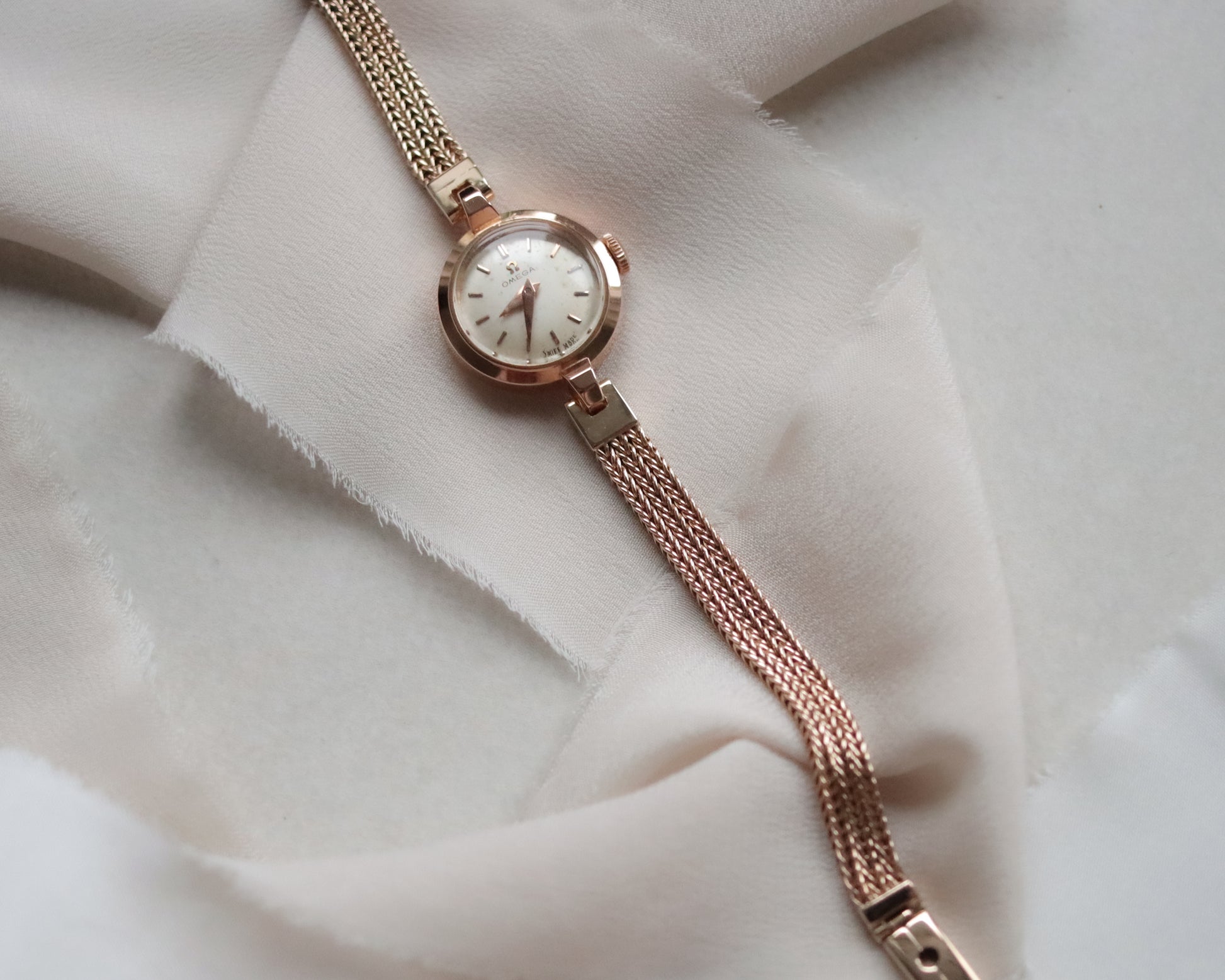 A beautifully elegant vintage Omega ladies’ dress watch, dating to the 1960s, combining refined Swiss watchmaking with delicate gold jewellery craftsmanship. The watch is housed in a solid 18ct rose gold case, whose warm tone perfectly complements the soft, feminine aesthetic of the period.