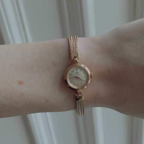 Enhancing its jewellery appeal, the watch is fitted with a striking three-strand woven 9ct gold chain bracelet, offering fluid movement and a luxurious feel on the wrist. The bracelet is secured with a 9ct gold clasp stamped “Made in England”, confirming quality construction and period correctness.