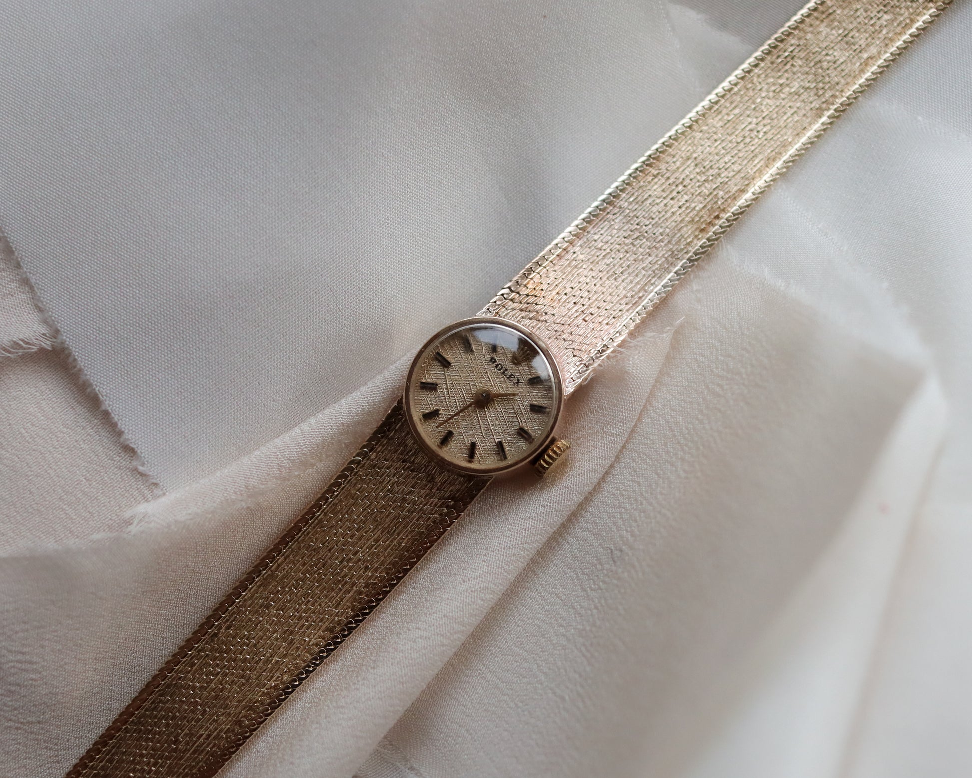 The 20mm case is complemented by a matching gold linen-effect dial with applied baton hour markers, creating a harmonious and luxurious aesthetic. Signed across the dial, movement and case, the watch retains complete authenticity. Its integrated 9ct gold mesh-link bracelet flows seamlessly into a secure deployment clasp, offering both comfort and understated elegance on the wrist.