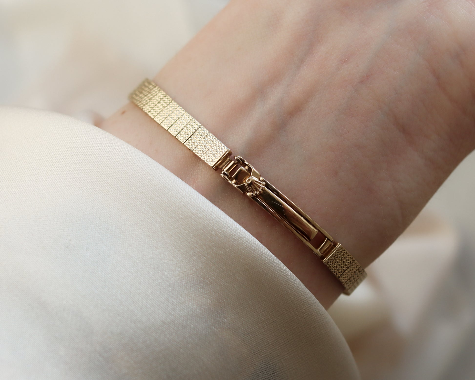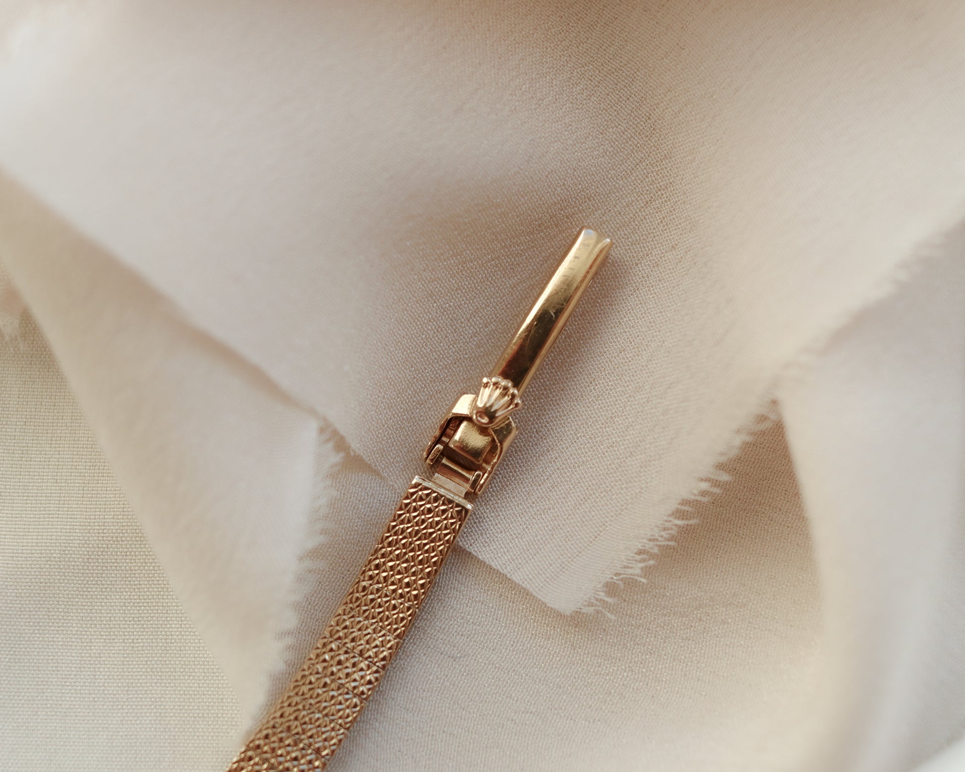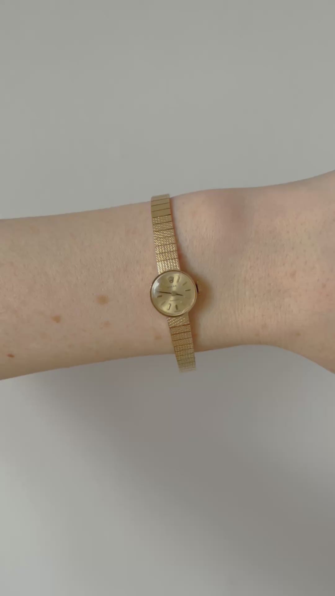 The 15mm case (excluding the winding crown) is paired with a textured 9ct gold brick-link bracelet, secured with a signed Rolex clasp and designed to fit wrists approximately 16.5–17cm. Weighing around 16.5 grams, the watch sits gracefully on the wrist and retains a crystal-clear, pristine crystal that enhances its exceptional presentation.